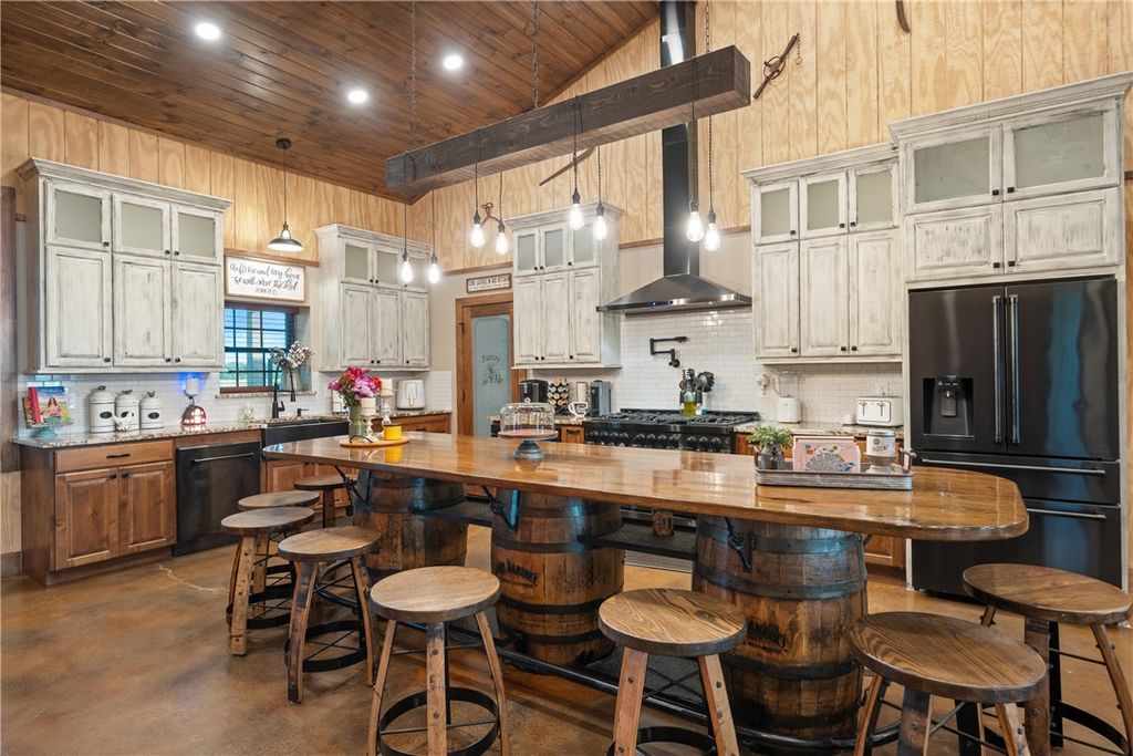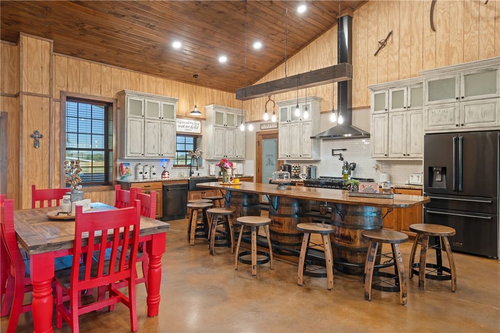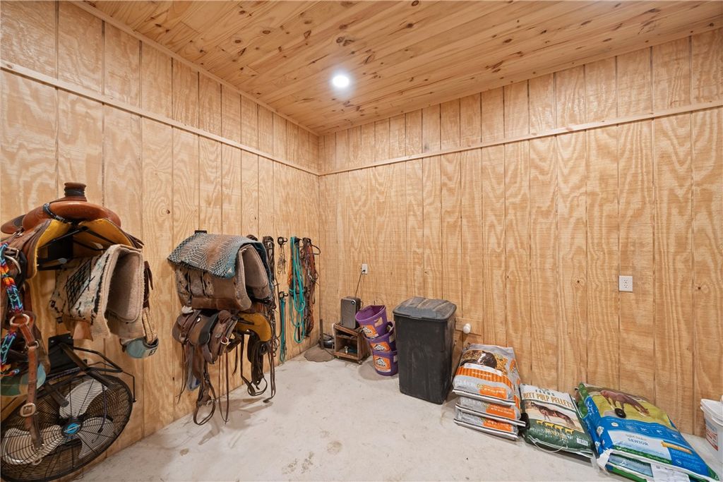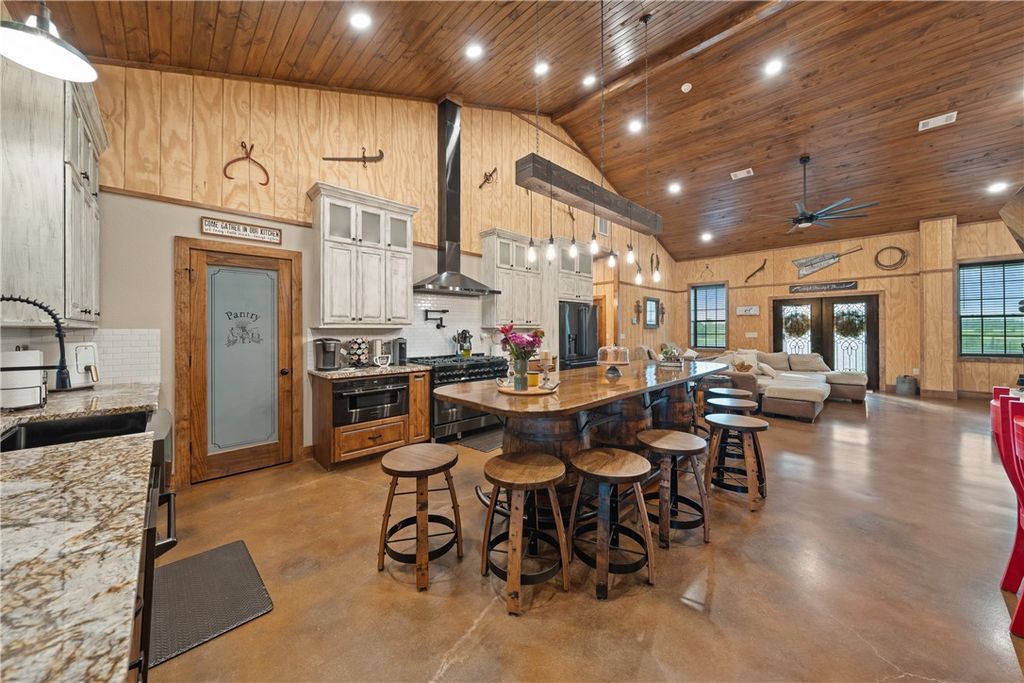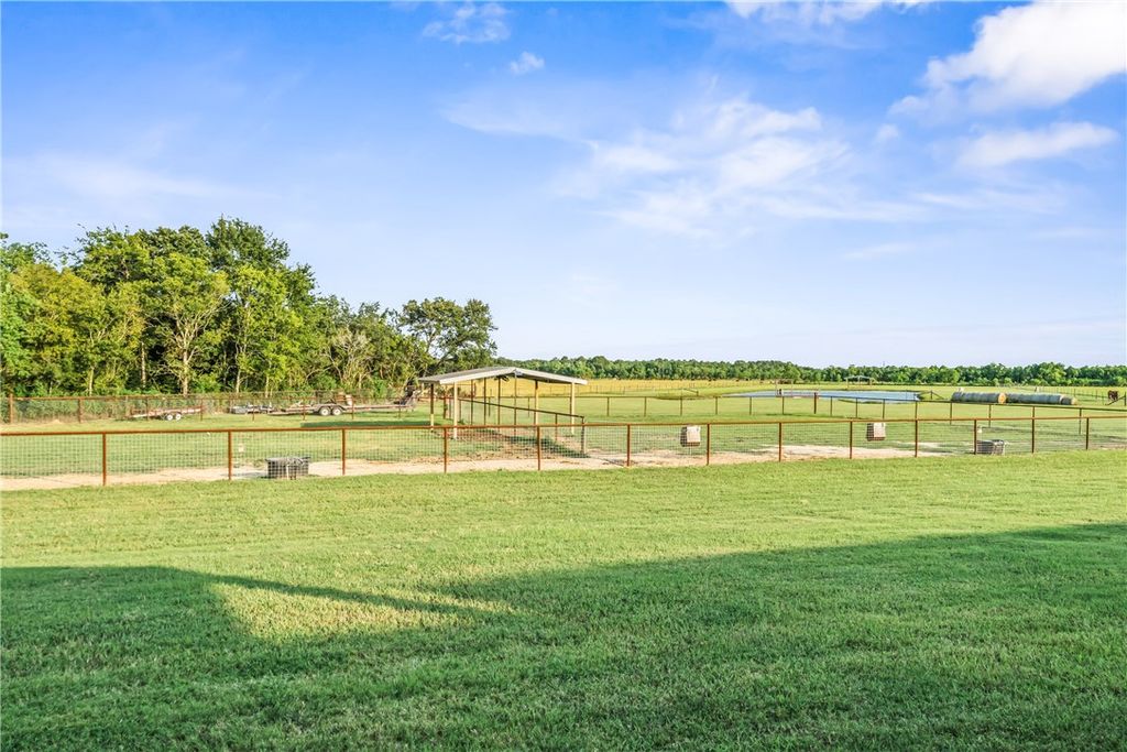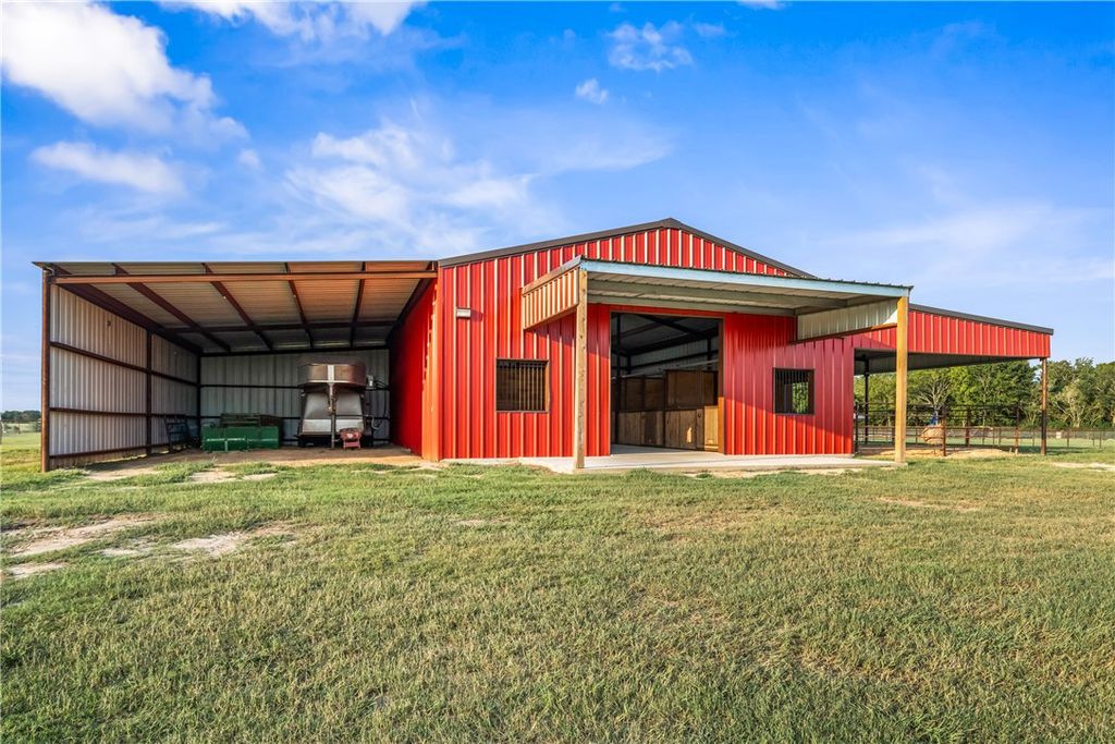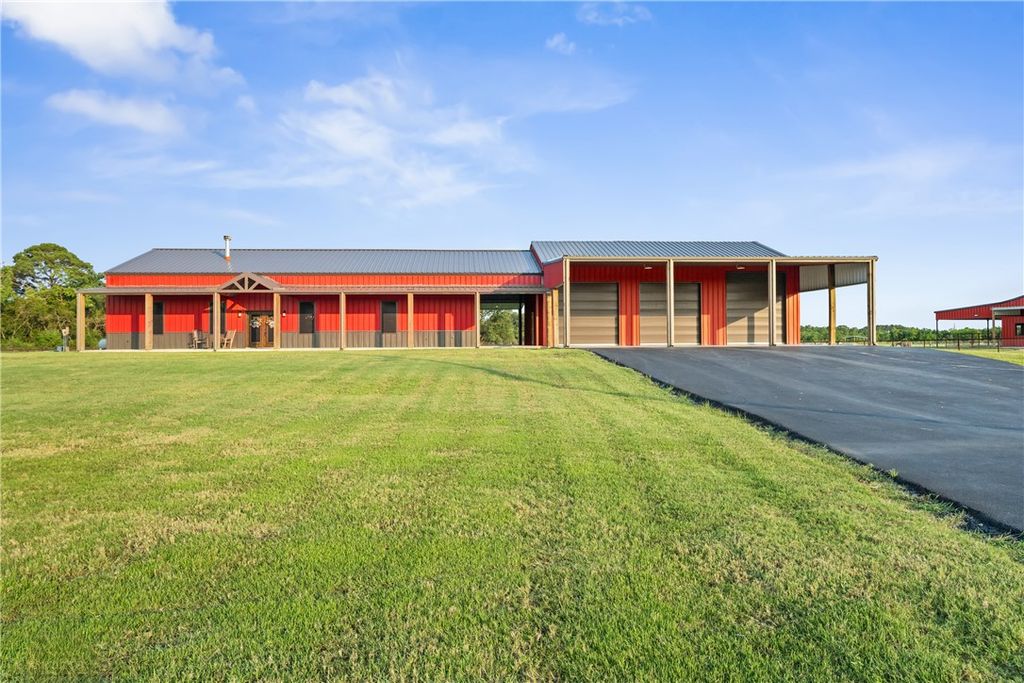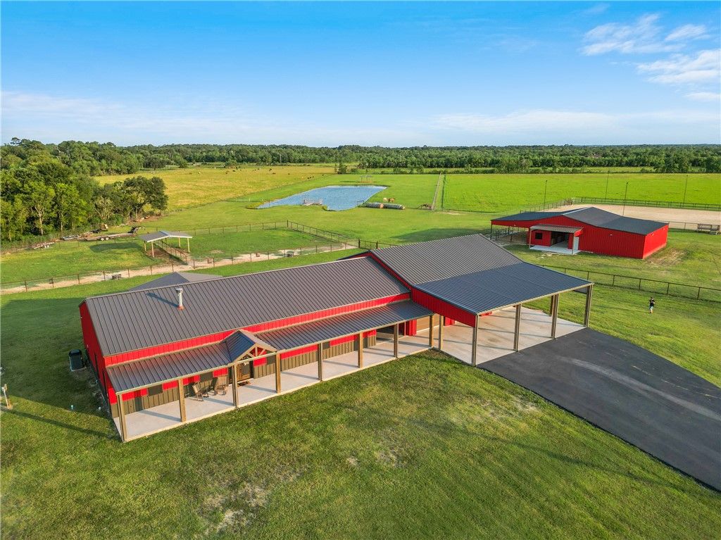 Custom 4-bedroom (or 3+ office), 3-bath metal home on +/-23 acres with shop, barn, arena, and stocked pond. Built 3' above county elevation with 150 mph wind-rated construction, engineered slab, spray foam insulation, solar screens, and LED lighting. Thoughtfully designed to capture views of the turnout pens from the kitchen, primary suite, and back patio. Gourmet kitchen features Z-Line appliances, granite counters, custom cabinetry, and oversized whiskey barrel island. Vaulted living area offers stone fireplace and open layout. Primary suite includes freestanding tub, walk-in shower, and large closet. Outdoor living with covered porches and 24' x 30' patio. Equestrian amenities include 6-stall barn, climate-controlled tack room, 150' x 250' lighted arena, turnout pens, and hay pasture. Generac 26 kW generator powers home, barn, and arena"”ready for equestrian use, agriculture, or enjoying wide-open space in a prime location.