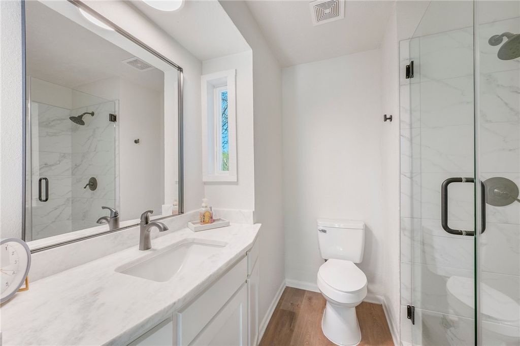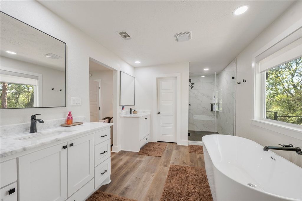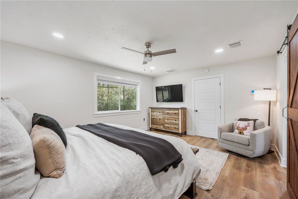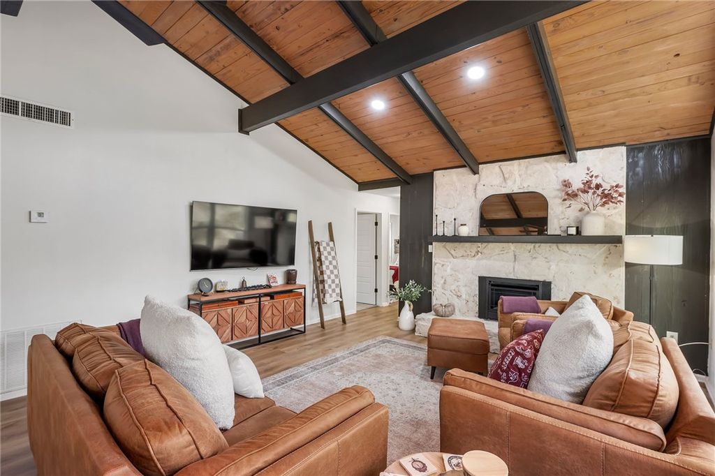 Modern Woodland Retreat on 1.18 Private Acres! Experience the best of both worlds in this exquisitely remodeled modern home, offering peaceful seclusion just seconds from the city limits and on 1.18 wooded acres -- this property is a rare and unique find. The open-concept interior immediately impresses with soaring cathedral wood ceilings, and a statement German schmear gas fireplace. The brand-new kitchen is a showpiece, featuring a massive quartz island, white shaker cabinets, and new stainless appliances. A wall of windows and expansive decks seamlessly blend indoor and outdoor living, offering stunning forest views. The private, spa-like primary suite is your personal sanctuary, complete with a standalone tub and a double shower. With a smart split-floor plan, three additional bedrooms, 2 more full baths, a separate den/office space, and an outdoor firepit, this home is designed for modern living. several large windows, spacious decks, and serene woodland views. Upgrades include: quartz and granite counters, tile backsplash, luxury vinyl plank flooring, gas fireplace, and fresh paint! There is a beautiful wood double front door, drop zone, pantry, separate laundry room -- this home is packed full of must have features!