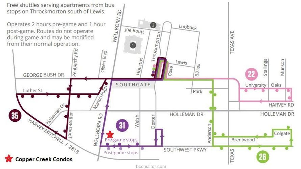Attention investors, looking for a fully furnished leased property! Welcome to Copper Creek Condos, a premier gated community located just minutes from Texas A&M University! This spacious 4 bedroom, 4.5 bathroom unit offers the perfect blend of comfort and convenience. Each bedroom features its own private en-suite bathroom and walk-in closet, providing privacy for residents and making it ideal for student living or shared occupancy. The open-concept living area flows into the kitchen, complete with granite countertops, eating bar, and plenty of cabinet space. Enjoy a private balcony for relaxing outdoors. The community includes resort-style amenities such as a pool, hot tub, clubhouse, fitness center, and dedicated shuttle service to campus. Copper Creek is highly sought-after for both investors and parents of students, offering a strong rental history and professional on-site management. Conveniently located near shopping, dining, and major roadways, this condo is move-in ready and an excellent long-term investment opportunity.