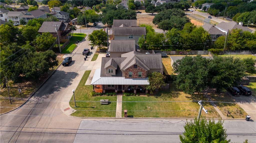 Located in the sought-after Southside Historic area just minutes from Texas A&M, this exceptional property offers comfort, style, and investment potential. The main home features 4 spacious bedrooms with private en-suites, plus a guest half bath. Ideal layout with 2 bedrooms down and 2 up, along with a secondary living area. The open-concept kitchen and dining flows to the large living room with wood vaulted ceilings and abundant storage throughout and tons of natural light. A private apartment with its own entrance includes a living area, kitchen, bedroom, full bathroom with walk-in shower, and a balcony with views of KYLE FIELD. The backyard is built for entertaining with a covered patio and outdoor fireplace. Includes a 2-car garage plus parking for 10. Fully leased through July 2026, this rare find offers luxury living and Aggieland convenience.