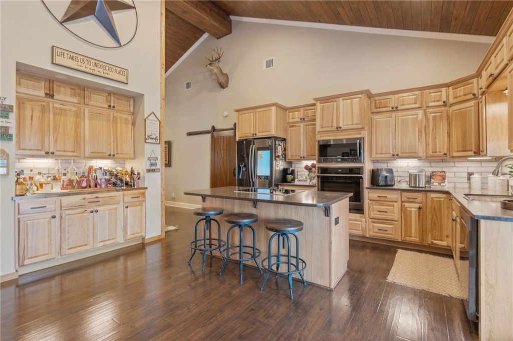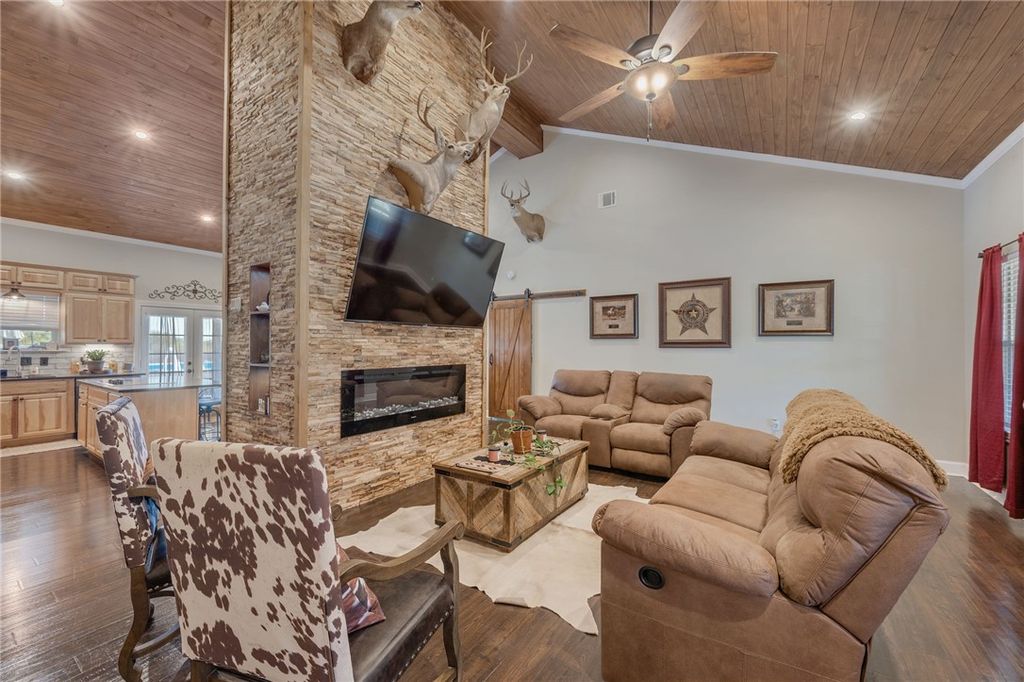 Charming country home with 3 bedrooms and 2 baths, nestled on 17+ acres with plenty of room to roam! A spacious front porch welcomes you to sit back and relax while enjoying peaceful country views. Inside, you'll feel right at home with a stunning floor-to-ceiling stone fireplace, rich wood floors, and vaulted beadboard ceilings with recessed lighting. Large windows fill the home with natural light. The open-concept kitchen features granite countertops, a stone backsplash, and a coffee and wine bar tucked behind the fireplace, plus custom built-ins on each side for decorative display. Off the kitchen, you'll find a convenient laundry room and pantry. The primary suite is a true retreat with a cozy fireplace, large walk-in shower, dual vanities, and generous closet space. Two spacious secondary bedrooms with large closets share a hall bath with a walk-in shower. Step out back to a covered porch overlooking the pool and deck"”perfect for entertaining. Enjoy evenings around the firepit or relaxing in the wide-open yard. The property is fully fenced, complete with a horse pen and barn, offering plenty of options for animals or hobbies. With room for a 3-car garage (design plans included), this property is filled with potential to create your dream country lifestyle.