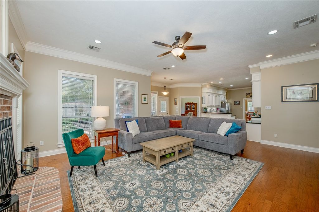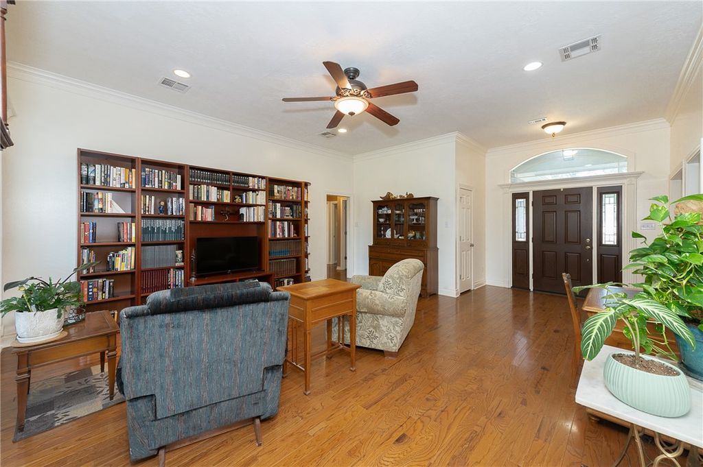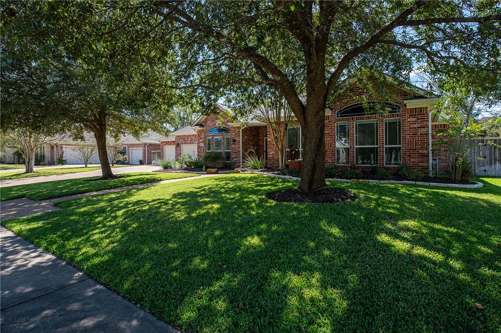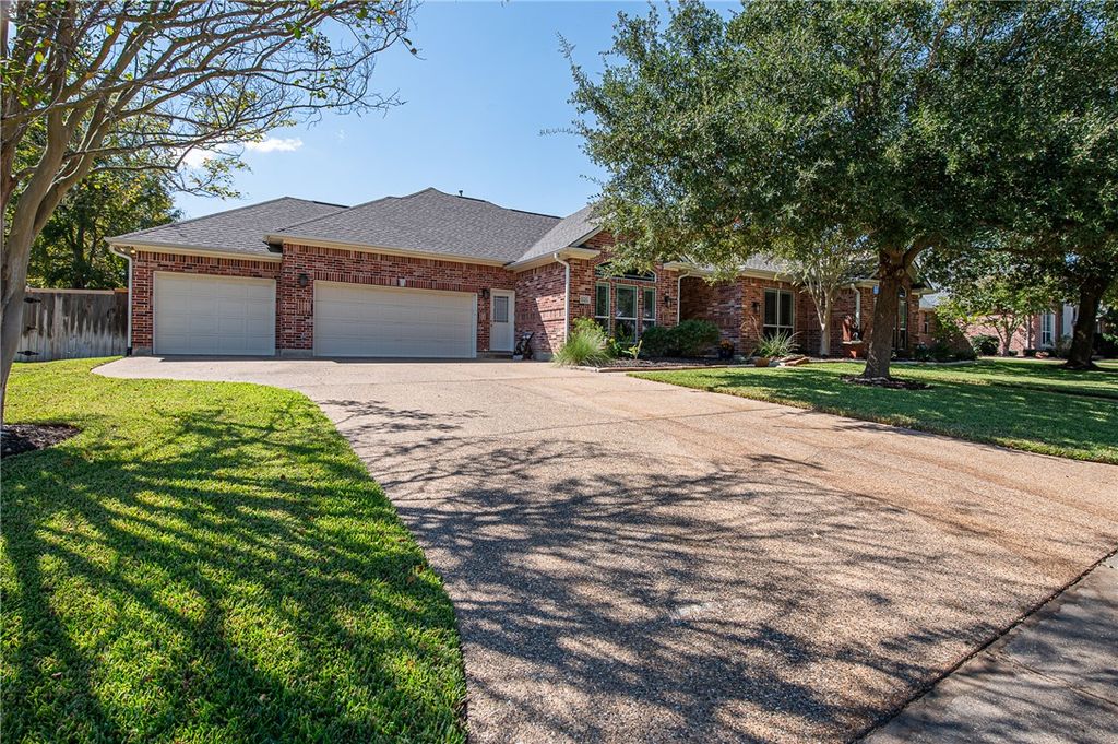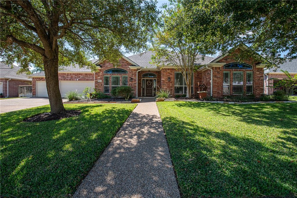 Discover this beautifully maintained 3,142 sq. ft., four bedroom, three bath home in the heart of Pebble Creek, offering generous space and flexibility for everyday living and entertaining. With two spacious living areas, three dining spaces, and a rare second master suite with a private en suite bathroom, this home is perfect for multi-generational living or hosting guests. Inside, impressive crown molding accents most of the rooms, adding a touch of elegance throughout. The large secondary bedrooms offer plenty of space, large closets and can easily serve as a home office, gym, or craft room. Recent updates include wood floors, new carpet in the bedrooms and fresh paint. The oversized three-car garage includes lots of storage space. Ideal for organization and hobbies. Step outside to a serene backyard featuring large mature trees and a covered patio, perfect for relaxing or entertaining. Located on a quiet street, this home is just steps from the neighborhood park and minutes from Pebble Creek Country Club. The art sculptures in front of the house do not stay with the house. Enjoy easy access to shopping, dining, and everything South College Station has to offer. The roof and one hot water heater were replaced in 2021. One AC unit and the furnace were also replaced in 2021.