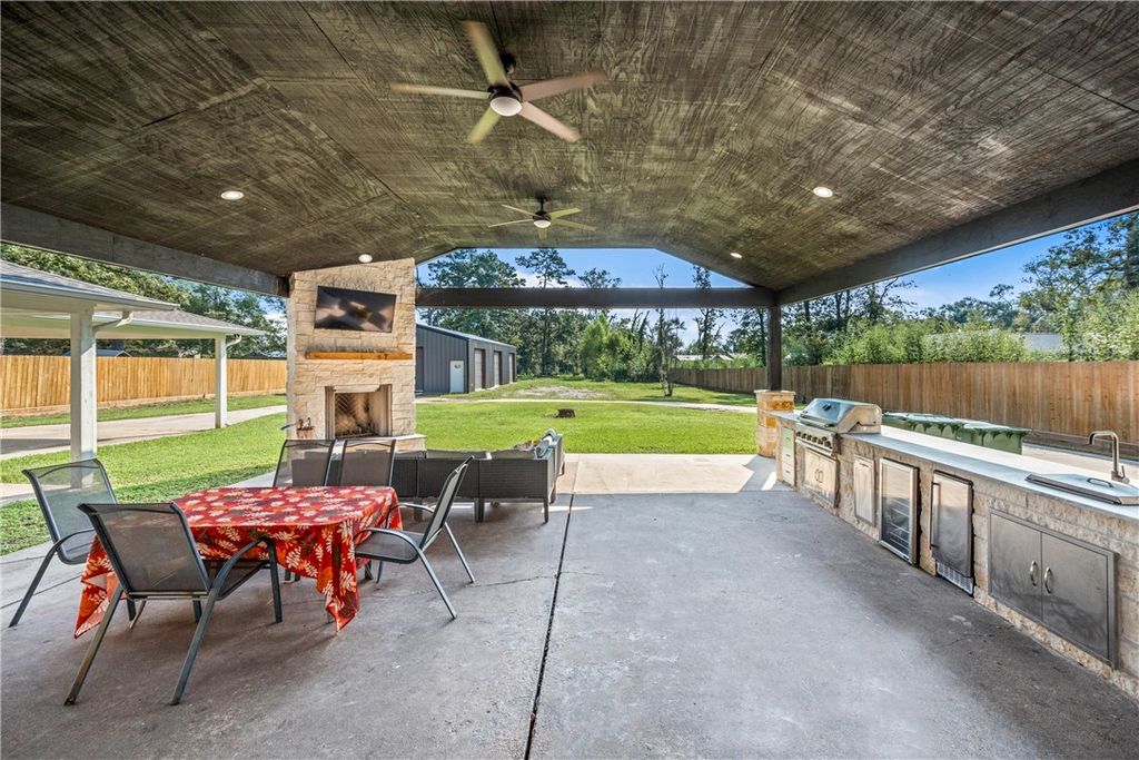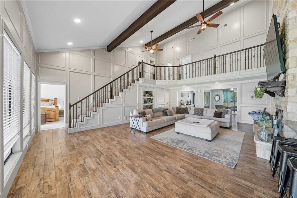 Gorgeous brick home with 5,000+ sq ft of living space, 6 beds/4 bath on 17.91 unrestricted acres with gated entrance and privacy fence. Inviting front porch with double doors, opening to entry, sitting room and dining room. Island kitchen offers abundant storage, brick accent wall, breakfast bar, walk-in pantry with sliding barn door, corner sink with window and breakfast nook, all flowing into the living room with vaulted ceilings, exposed beams & floor-to-ceiling stone fireplace. Downstairs includes two primary suites with full baths, an additional bedroom and bath and media room, while upstairs offers 3 oversized bedrooms"”2 with balcony access"”sharing full bath. Utility room provides extra cabinetry, countertop space and sink. Outside, concrete driveway with circle drive, attached carport, covered patio with outdoor fireplace & kitchen, 1800 sq ft workshop with 3 bay doors and 15+ acres behind could be used for horses, barn or other possibilities, make this property an exceptional find.