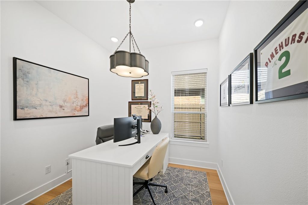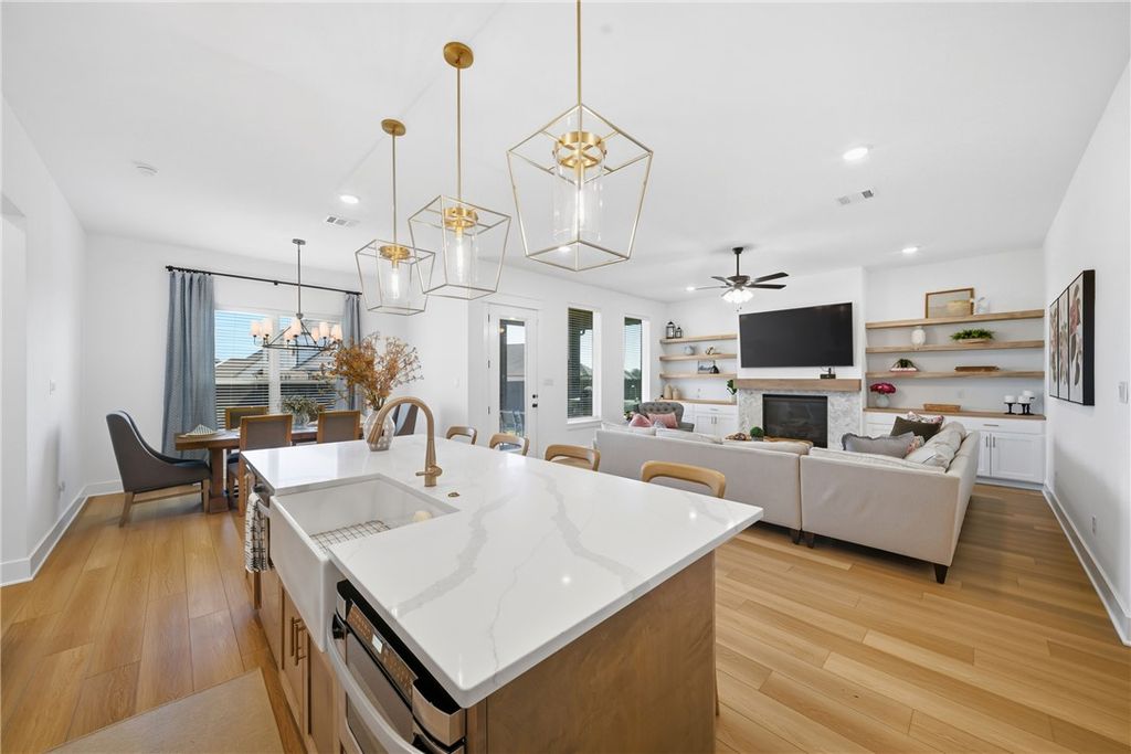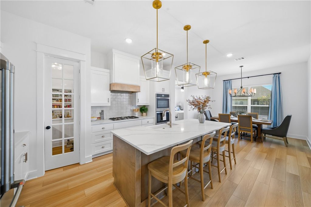 Modern and functional, this stylish 3-bed, 3.5-bath home with a dedicated office offers a luxury feel and a highly efficient floor plan. The open-concept layout flows seamlessly from living to dining to the designer kitchen"”featuring a large island, stainless steel appliances, pendant lighting, and a striking backsplash. A butler's pantry adds additional storage and prep space that is not found in many other homes. The light-filled primary suite includes a spa-like ensuite bath with dual vanities, a soaking tub, a walk-in tiled shower, private water closet, and direct access to a spacious walk-in closet that connects to the laundry room. Each secondary bedroom has its own private bathroom. A stylish half bath and a separate office complete the interior layout. Enjoy outdoor living with a covered patio and outdoor kitchen. With high-end finishes throughout, this home is modern, comfortable, and feels like new. Residents can enjoy a coffee bar cafe, fitness center, resort-style pools, playgrounds, parks, sport courts at Oakmont's Amenity Center. Throughout the neighborhood there are scenic trails and sidewalks to enhance an active lifestyle.
