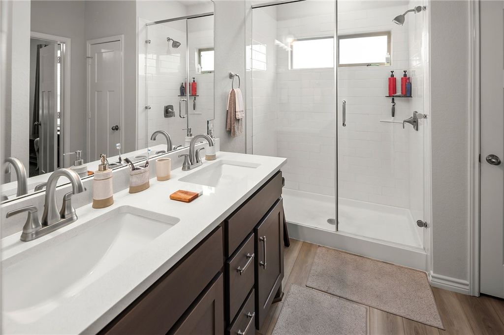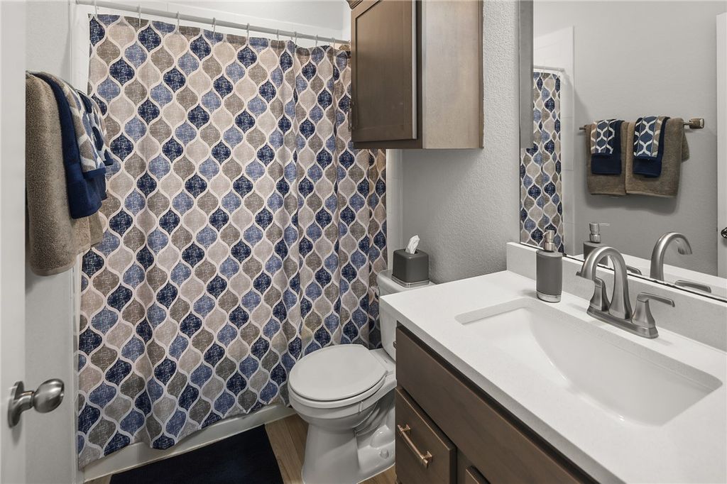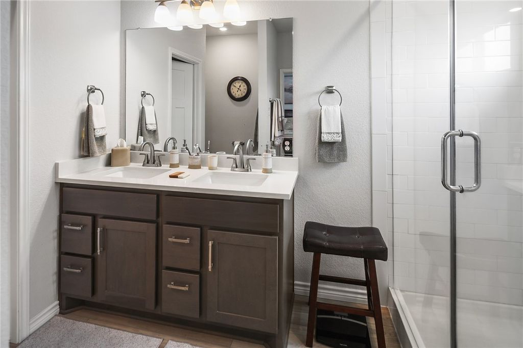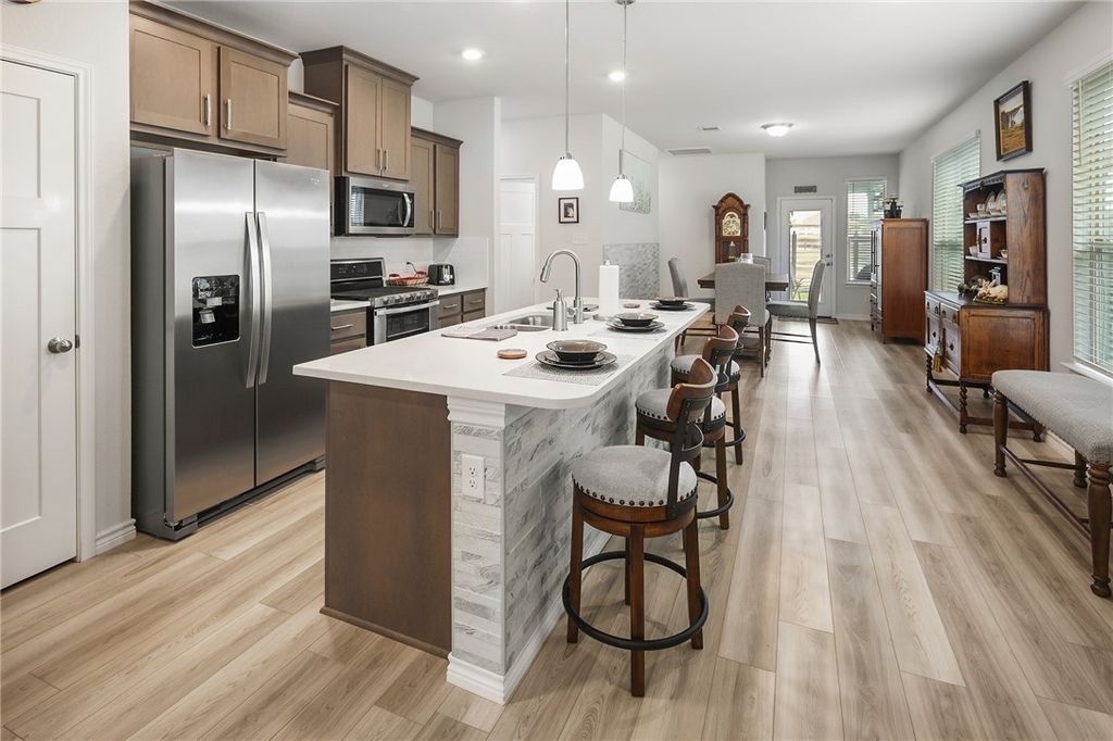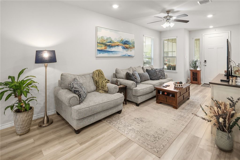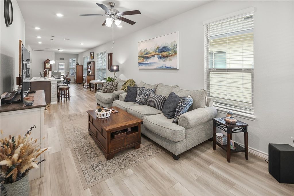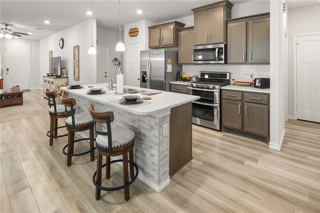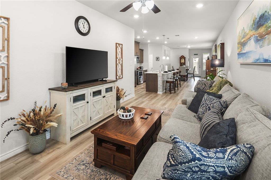 OPEN HOUSE SUNDAY, NOVEMBER 2ND 1-4. Better than new! This meticulously maintained home is centrally located in desirable College Station Midtown Reserve. It features 1,531 square feet arranged in an efficient 3 bedroom, 2 bathroom plan. This floorplan centers around the open concept kitchen with an island that provides dining on one side and living on the other, affording either three distinct spaces, or one large flowing space great for entertaining. The kitchen is ideal for everyday cooking or feeding a crowd with quartz countertops, a gas range with an integrated double oven feature, and a stylish tile upgrade on the island (no more fidgety feet scuffing the paint!). A matching tile accent wall in the dining area adds a distinctive touch of design continuity. Each bedroom, along with the living room, is equipped with ceiling fans for added comfort and energy efficiency. The primary suite offers a comfortable retreat with ample space. The primary bathroom features dual sinks and a large walk-in shower. Enjoy peaceful outdoor living with no backyard neighbors. Additional highlights include: Registered HVAC equipment parts warranty through 2031, ADT alarm system equipment included (a $1,500 value). Discover the convenience of Midtown Reserve located moments from Scott and White Hospital, shopping, and restaurants. Welcome Home!