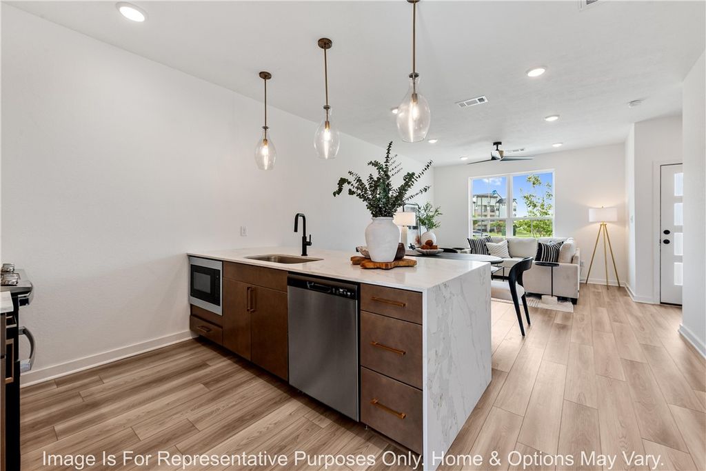 Each two-story townhome features a comfortable and functional design. The first floor welcomes you with an open floorplan that begins with a spacious living room bathed in natural light from a large window. Adjacent is a cozy dining area enhanced by recessed lighting, creating the perfect space for meals and gatherings. The kitchen boasts a peninsula island with bar seating, a built-in sink, and a dishwasher, complemented by a nearby refrigerator and stove. For added convenience, there's a powder room and pantry on this level. Upstairs, the thoughtful design continues with two well-sized bedrooms and a shared bathroom. A utility closet at the top of the stairs ensures laundry tasks are easy and efficient. Every element of these townhomes has been carefully planned to provide comfort, functionality, and modern living at its best!