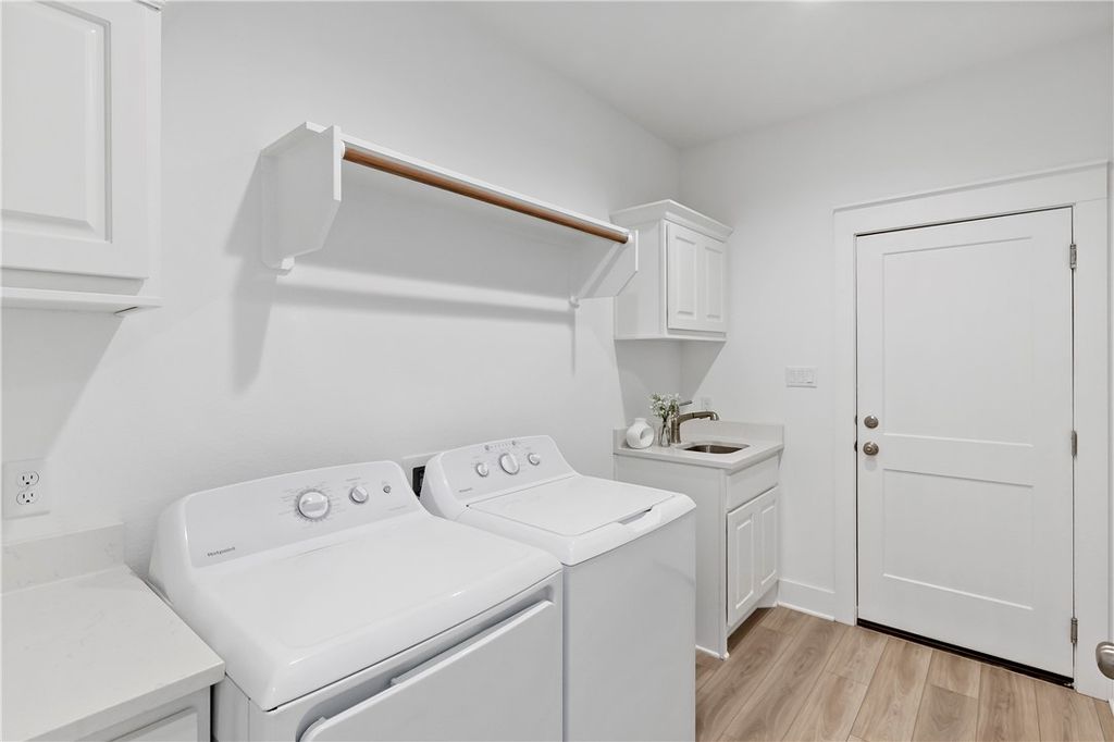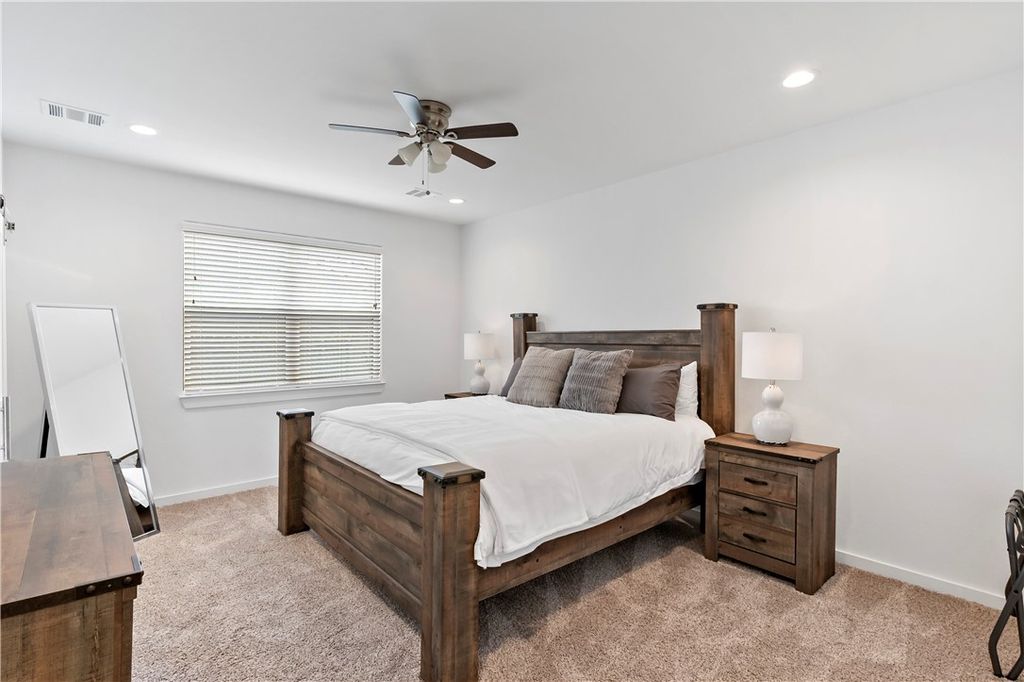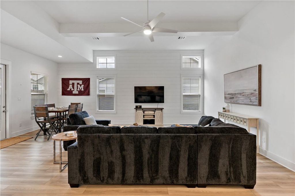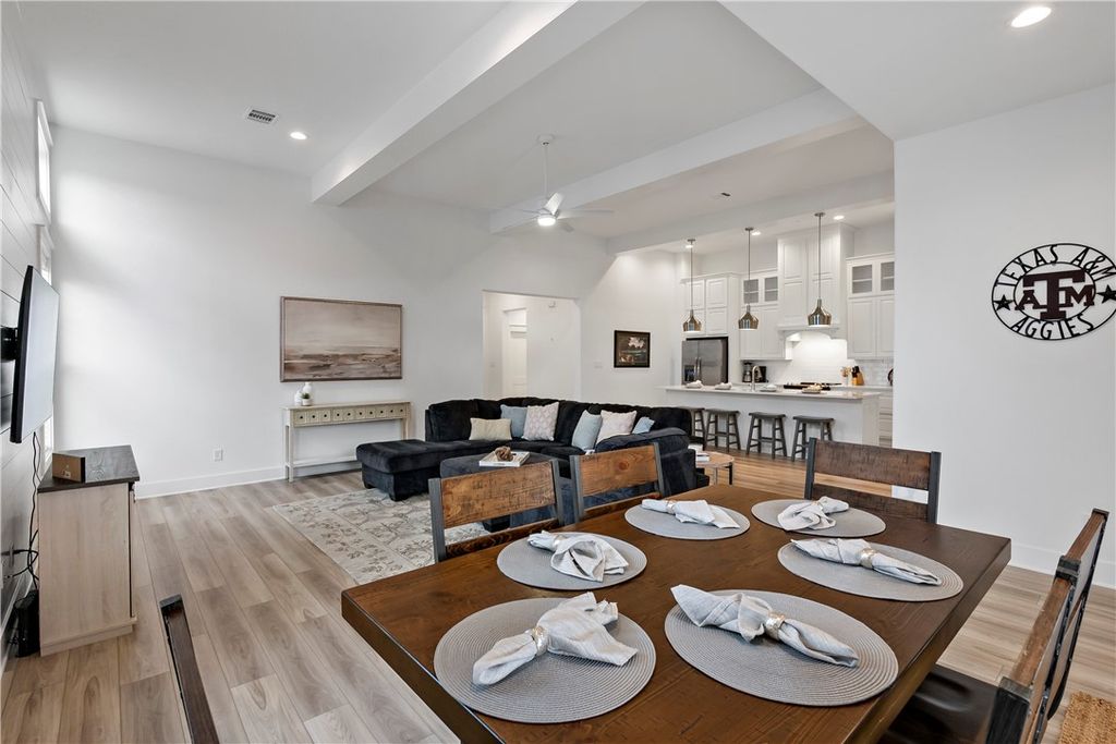 Offered FULLY FURNISHED, this 3-bedroom, 2-bath home is ideal as an Aggie Game Day retreat or a permanent residence. The open-concept floor plan features a bright, modern farmhouse kitchen and a spacious living area highlighted by elevated ceilings and exposed beams. Thoughtful design details include shiplap accent walls, subway tile showers, and charming barn door accent in the primary bathroom. Neutral carpeting and durable vinyl plank flooring create a versatile, move-in-ready backdrop. The laundry room, conveniently located off the two-car garage, includes a sink, plenty of storage, and a washer and dryer. Enjoy outdoor entertaining on the covered patio and fenced backyard. Located in the Oakmont subdivision, residents enjoy impressive community amenities, including a fitness center, resort-style pools, splash pad, sports fields, and scenic hiking and biking trails.