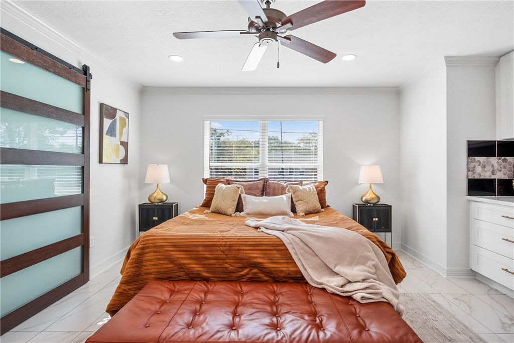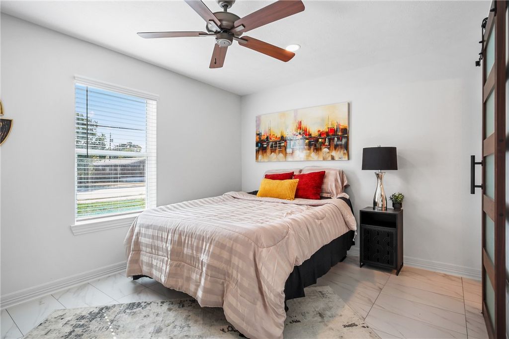 This gorgeous fully remodeled home features quartz countertops, brushed gold plumbing and light fixtures, and beautiful hardware throughout the kitchen and bathrooms. With designer tile flooring throughout the home, this home features four bedrooms and three bathrooms, including two primary suites. A cook's dream with all the counter space and stainless appliances, the kitchen has an abundance of cabinets for storage. At the kitchen sink, there is a window with a view of the backyard. Its barn doors leading to all bathrooms add a touch of style that makes it unique. Located on a corner lot with a large covered patio, a new fully fenced backyard and landscaping in the front and back that are inviting and easy to maintain. New roof, HVAC, sheet-rock, recessed lights, ceiling fans, water heater, windows, doors, exterior paint and hardi-plank, half circle driveway and so much more!!!