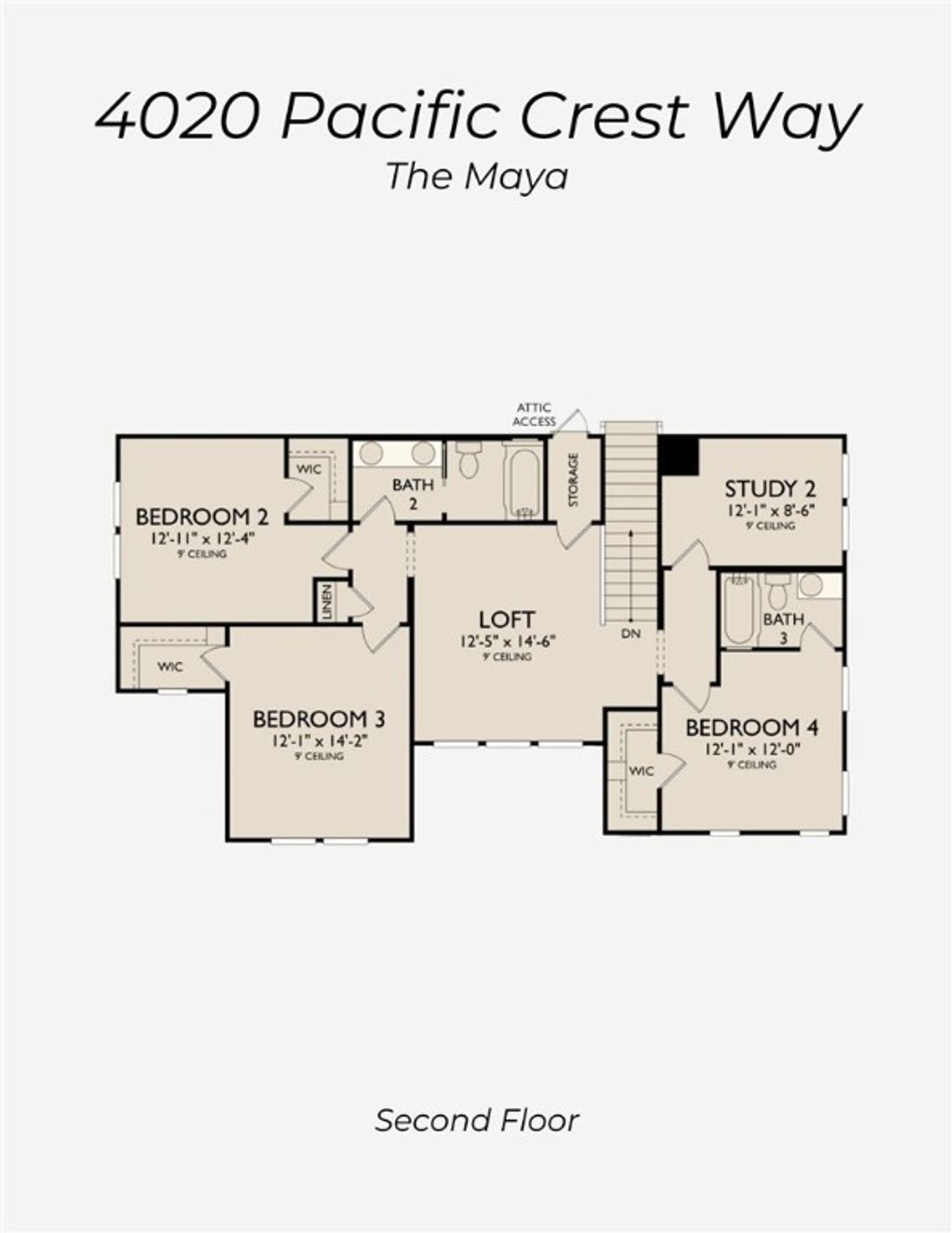 The Maya is an impressive 2-story home, stylishly crafted for both comfort and privacy. Featuring five bedrooms, four full bathrooms, and a study, this home is designed for the modern lifestyle. Built on a greenbelt lot with no backyard neighbors, you'll also enjoy ultimate privacy right at home. The first floor features an expansive family room and kitchen, including a versatile scullery adjacent to the pantry. The fireplace and built-in shelving in the family room create a great backdrop for relaxing evenings at home, while the double sliding glass doors leading to the covered patio are convenient for entertaining guests. The owner's suite, conveniently located on the first floor, boasts a large walk-in closet and spacious full bath with dual sinks. Upstairs, you'll find three additional bedrooms, a convenient study, and a central loft space - useful for a game room. With garage space for three vehicles and walk-in closets provided in each bedroom, it's no secret as to why The Maya is one of our most sought after plans.