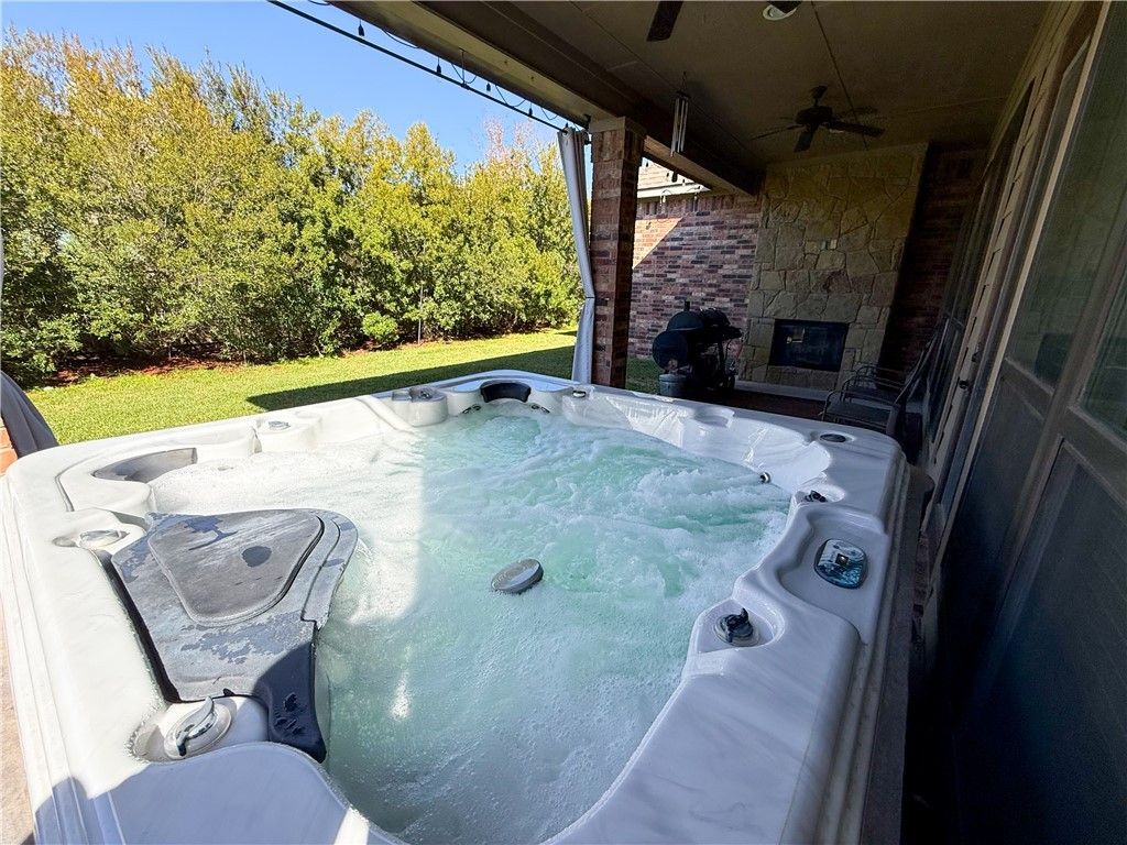 Tucked away in the highly sought-after Castlegate II community of College Station, this Single Owner, Omega Homes-built residence offers space, style, and a sense of calm, without giving up easy access to everyday essentials. More upgrades than I could list and with 2,049 square feet, this 4-bedroom, 2-bath home is thoughtfully designed for comfortable, effortless living. The open-concept living area is highlighted by a striking pop-up ceiling and abundant natural light, creating a space that feels both welcoming and expansive. The kitchen features under-cabinet lighting, generous cabinetry, and a walk-in pantry, perfectly suited for entertaining or daily routines. The primary suite is a true retreat, offering a garden tub, custom walk-in shower with rain faucet, double vanities, and alarge walk-in closet. Secondary bedrooms are oversized with ample closet space, offering flexibility for guests, work, or play. A covered patio creates an inviting outdoor living space, anchored by a beautiful gas fireplace. The private backyard and hot tub complete the experience, offering a perfect blend of relaxation and function. Additional features include a large laundry room with washer and dryer included, a two-car garage, and updates throughout that reflect pride of ownership. Castlegate II residents enjoy outstanding neighborhood amenities and convenient access to shopping, dining, and medical facilities quietly set within one of College Station's most desirable communities.