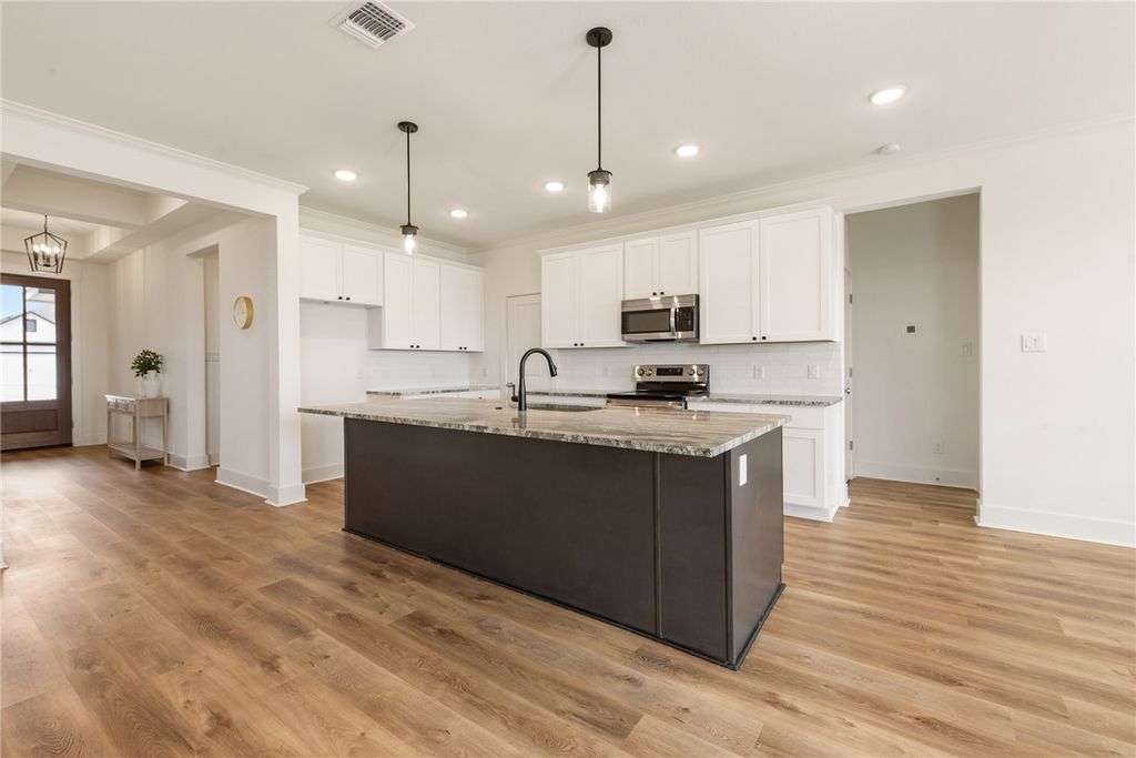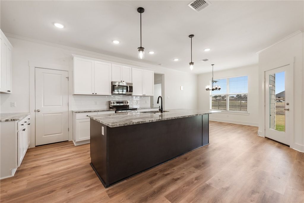 Escape the hustle and bustle to this beautiful 3-bedroom, 2-bath home located in the Grand Lake of Snook subdivision. This desirable split floor plan features an open-concept design, ideal for both everyday living and entertaining. Tall ceilings enhance the spacious living area, which flows seamlessly into the kitchen and dining spaces. The gorgeous kitchen showcases custom cabinetry, granite countertops, a large island, stainless steel appliances, and a walk-in pantry, with ample storage thoughtfully placed throughout the home. The private primary suite is a relaxing retreat, complete with a spa-inspired bath offering dual sinks, a soaking garden tub, an oversized shower, and a generous walk-in closet. Durable vinyl wood flooring extends through the living, kitchen, and dining areas, while cozy carpeted bedrooms and tile in the baths and utility room provide comfort and functionality. Additional features include recessed lighting throughout, and low-E windows. Step outside to enjoy the covered back patio overlooking the backyard and pond"”perfect for morning coffee or evening relaxation, along with the added convenience of a sprinkler system. The community offers access to a private lake, pier, and scenic walking trails, all just 15 minutes from Texas A&M University and Bryan/College Station. High-speed fiber-optic internet is included in the HOA dues. Schedule your private showing today and start making lasting memories in this beautiful home.