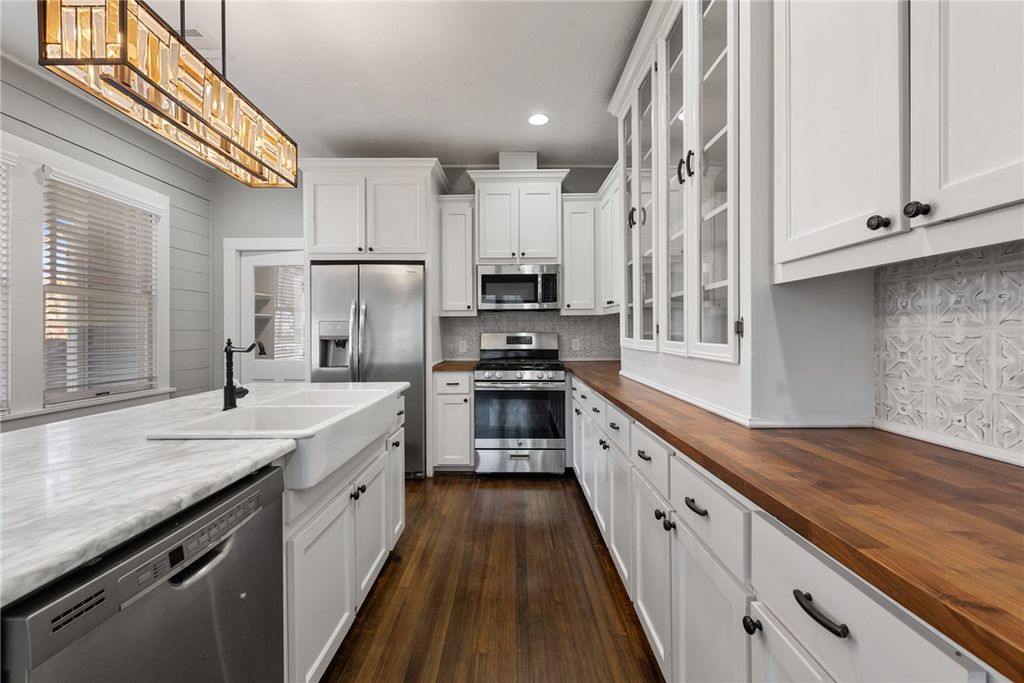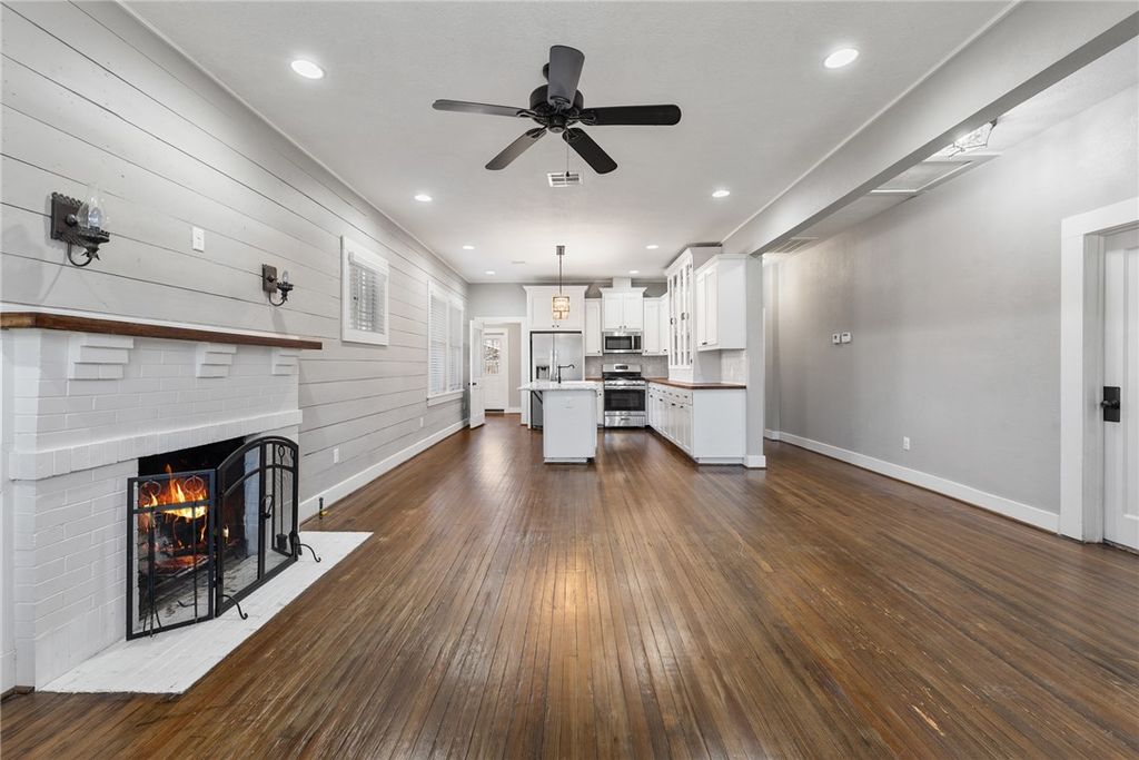 Welcome home to this adorable 3-bed, 3-bath charmer featuring an inviting covered front porch"”perfect for relaxing evenings and making memories while sipping lemonade. Inside, the spacious living room showcases beautiful hardwood floors, a cozy fireplace with a stylish mantel, decorative sconces, and a striking shiplap accent wall, all surrounded by abundant windows that flood the space with natural light. The light and bright kitchen is a true showstopper, offering stainless steel appliances, a farmhouse sink, butcher block countertops, a stunning display china cabinet, ample cabinetry for storage, and a center island with an eating bar topped with granite"”ideal for everyday living and entertaining. Retreat to the primary suite with plush carpet, dual vanities, a tiled walk-in shower, and a generous walk-in closet. The secondary bedrooms provide flexible space for guests, family, or a home office. Step outside to enjoy the private backyard featuring a covered deck perfect for entertaining or weekend BBQs, plus a storage shed for added convenience. Ideally located just minutes from Bryan's Downtown Historic District, with shopping, dining, spirits, theater, and live entertainment nearby. Don't miss the opportunity to see this delightful home"”schedule your showing today!