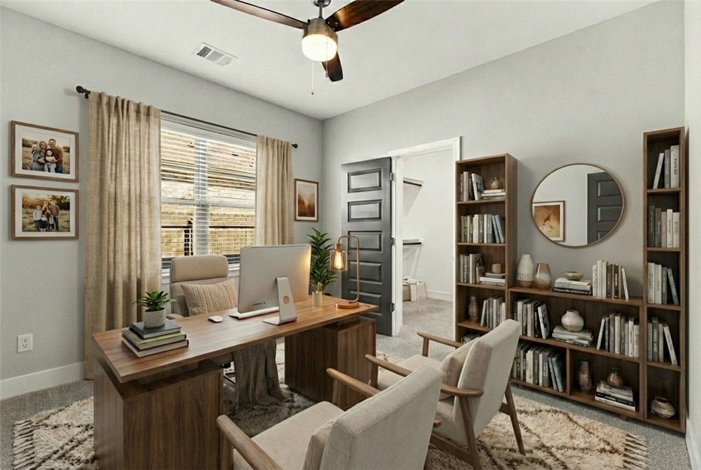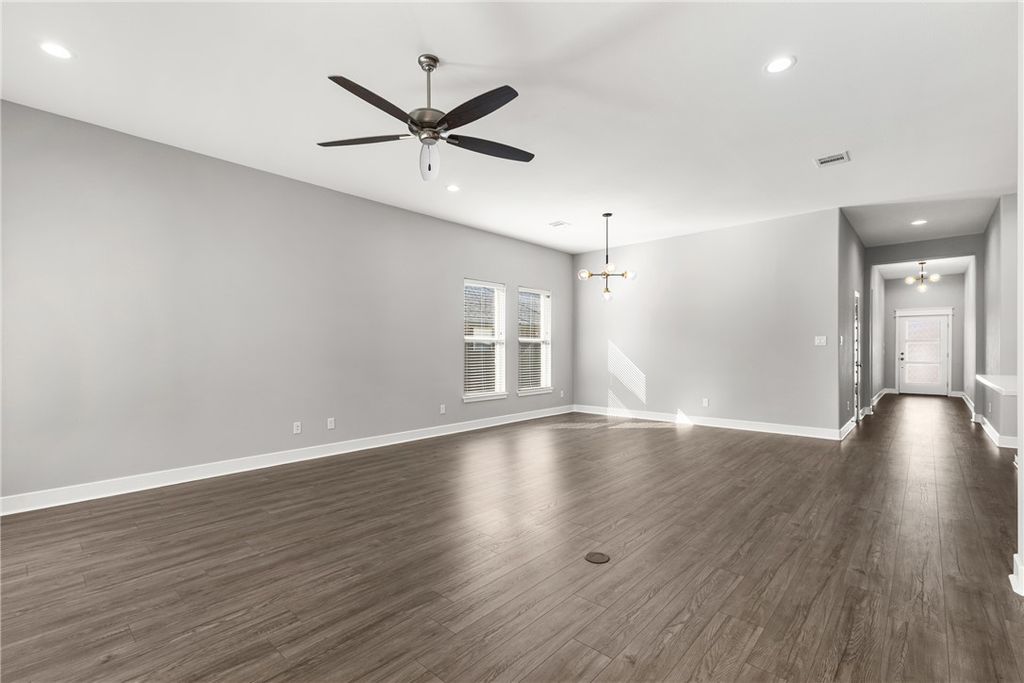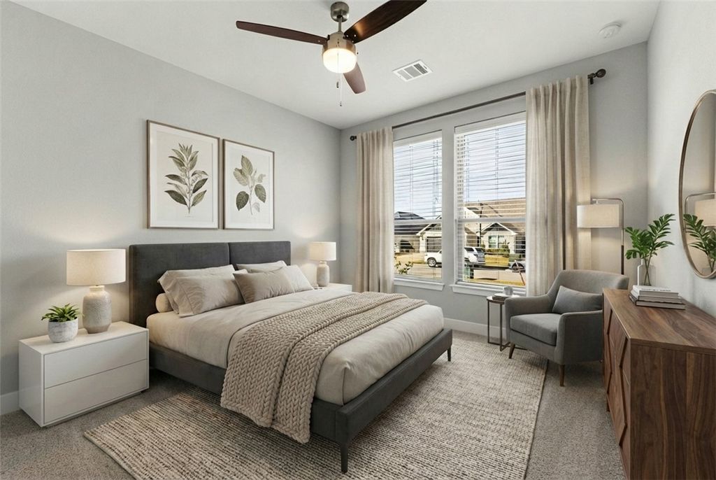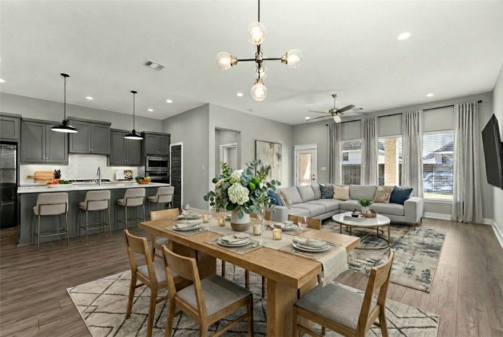 Beautifully built 4-bedroom, 2-bath home in the Oakmont neighborhood, offering modern finishes, thoughtful design, and abundant natural light. Located in a quiet area with no nearby loud construction, this home provides a peaceful everyday setting. The open-concept living, kitchen, and dining area features modern lighting, floor outlets in the living room, and a bright, welcoming feel. The kitchen includes quartz countertops, a large island with farmhouse sink, gas cooktop, built-in oven and microwave, and a walk-in pantry"”ideal for entertaining and daily living. A mudroom-style drop zone and separate laundry room with built-in drying rack sit just off the garage for added convenience. Ceiling fans in every room, including the living room, enhance comfort throughout. The primary suite offers a spa-like bath with walk-in shower, soaking tub, double sinks, and a large walk-in closet. A rare cut-through from the closet to an adjoining bedroom creates the perfect space for a nursery, home office, or study, providing flexibility and easy access while maintaining privacy. Enjoy outdoor living on the covered back porch with vaulted ceiling, exposed wood beams, and ceiling fan, overlooking a private, fenced yard. The living room door features mini blinds built inside the glass. This Oakmont home blends comfort, function, and style"”move-in ready and thoughtfully designed.