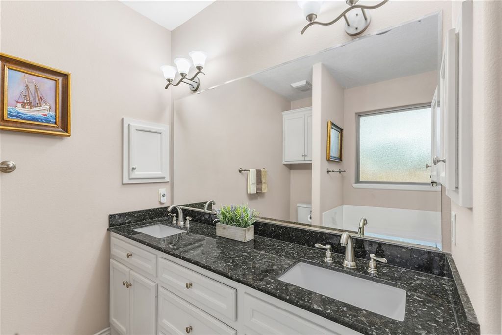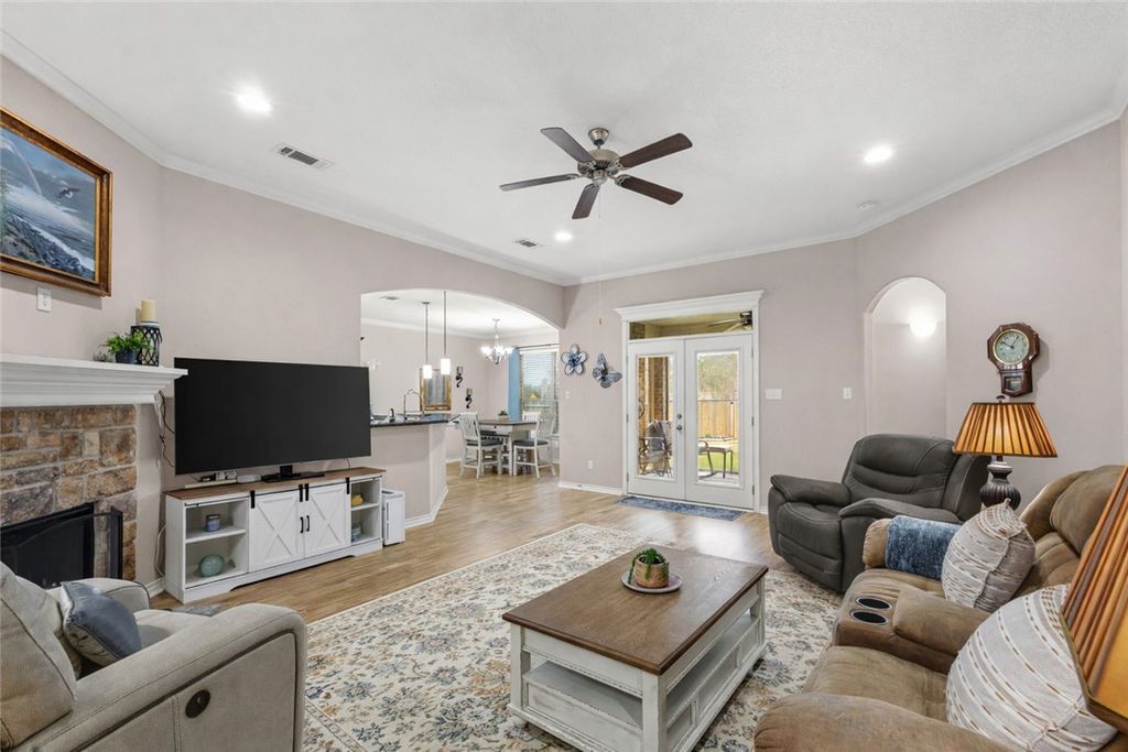 Welcome to this well-appointed 3 bedroom, 2 bath home situated on a desirable corner lot, thoughtfully designed for both comfort and functionality. Upon entering, you're greeted by an oversized living area highlighted by a stunning stone fireplace, creating a warm and inviting focal point, perfect for gatherings or cozy evenings at home. The kitchen is a true standout, featuring granite countertops, a gas range, abundant cabinet and counter space, and a convenient eating bar ideal for casual dining or entertaining. The primary suite, privately tucked away at the back of the home, offers a spacious retreat with an ensuite bathroom complete with granite countertops, dual sinks, a walk-in shower, and a separate jetted tub. Two additional bedrooms are located at the front of the home and share a hallway bathroom, providing comfort and convenience for guests or family members. Just off the main living area, the enclosed back porch offers versatile space for relaxing, enjoying your morning coffee, or taking in the outdoors year-round. Additional features include solar screens for energy efficiency and comfort, as well as front and back gutters for added functionality and peace of mind. Located near walking trails with covered picnic tables and offering easy access to Highway 6, this home blends everyday comfort with convenience and lifestyle appeal. Warm, functional, and thoughtfully designed, this home is the perfect setting for both effortless entertaining and daily living.