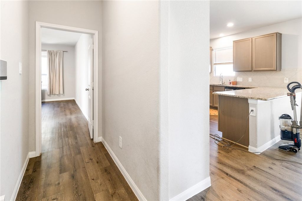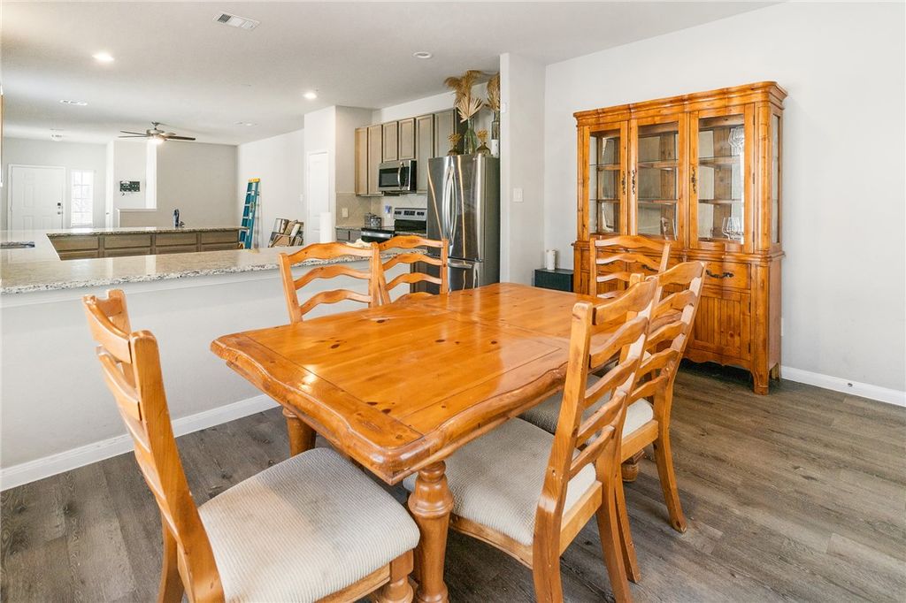 Built in 2022, this two-story home offers approximately 2,628 square feet with 5 bedrooms and 3.5 bathrooms and a functional layout designed for everyday living. The open-concept main floor connects the living, dining, and kitchen areas, providing flexible space for gathering and entertaining. The kitchen includes granite countertops, tile backsplash, stainless steel appliances, and ample cabinet storage. The first-floor primary suite features a walk-in closet and an en-suite bath with dual vanities, separate shower, and soaking tub. Upstairs offers additional bedrooms plus a second living or game room that can serve as a media room, office, or multipurpose space. Additional features include a brick exterior, energy-efficient construction, 2-car attached garage, fenced backyard, and sprinkler system. Located in the Alamosa Springs subdivision with convenient access to shopping, dining, and major thoroughfares. Buyer to independently verify square footage, schools, and property details.