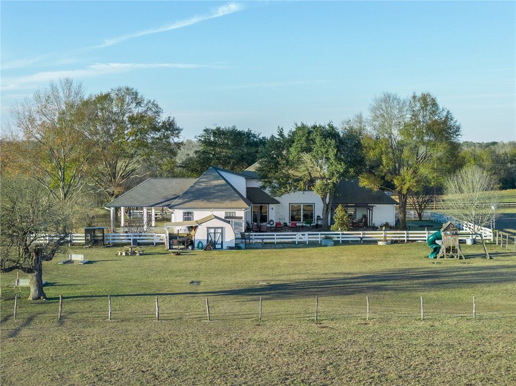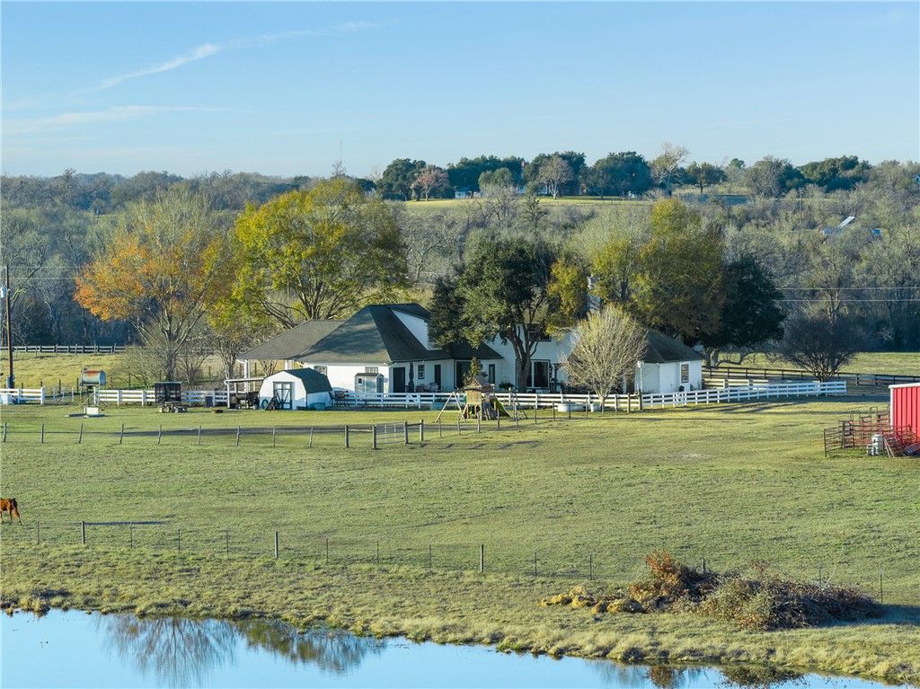 Rockin' H Ranch: This 15 acre ranch located in the historic Ranches of Doe Run offers a rare blend of legacy and modern comfort. Gated with a tree-lined drive leads to a 3,266 SF 5 Bed/3.5 bath custom home featuring a fully remodeled chef's kitchen with Belvedere Satin granite island, custom cabinetry, and 6-burner Wolf gas range. The open living area is anchored by a stone fireplace and new oversized picture windows framing panoramic hill country views and lake. Outdoor amenities include a 3,500 SF multi-use barn with 6 covered horse stalls, tack room, and a concrete-floor workshop. The land is cross-fenced for hay, featuring a 1.25-acre stocked lake, 2 wells, and a full-property generator. Low taxes, POA fees and agricultural exempt. Surrounded by luxury ranches, wineries and Houston only a little more than an hour makes this a weekend dream or full time experience. Kyle Field/College Station within 30 minutes. Community river park access included.