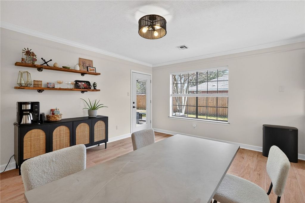 Located in Bryan's desirable Wheeler Ridge neighborhood, this inviting 4 bedroom, 2 bathroom home offers a functional layout with modern touches throughout. The spacious living room features a cozy wood-burning fireplace and a charming bay window that fills the space with natural light. The dining room flows seamlessly into the kitchen, which is equipped with stainless steel appliances, a gas range, and a deep farmhouse-style sink, combining style and practicality. The private primary suite includes an en-suite bathroom with a large walk-in shower, providing a comfortable retreat. Additional highlights include a two-car attached garage and a large backyard with a covered patio for outdoor entertaining or relaxing. Conveniently located within walking distance to Tiffany Park and Bower Elementary School, this home offers both comfort and a great location.