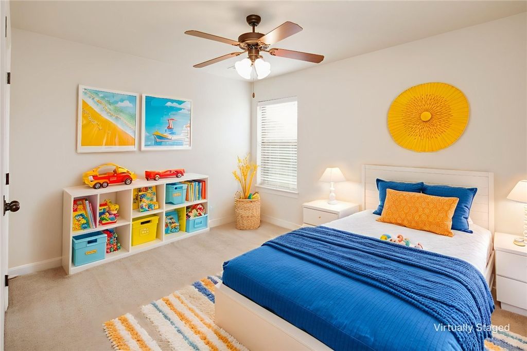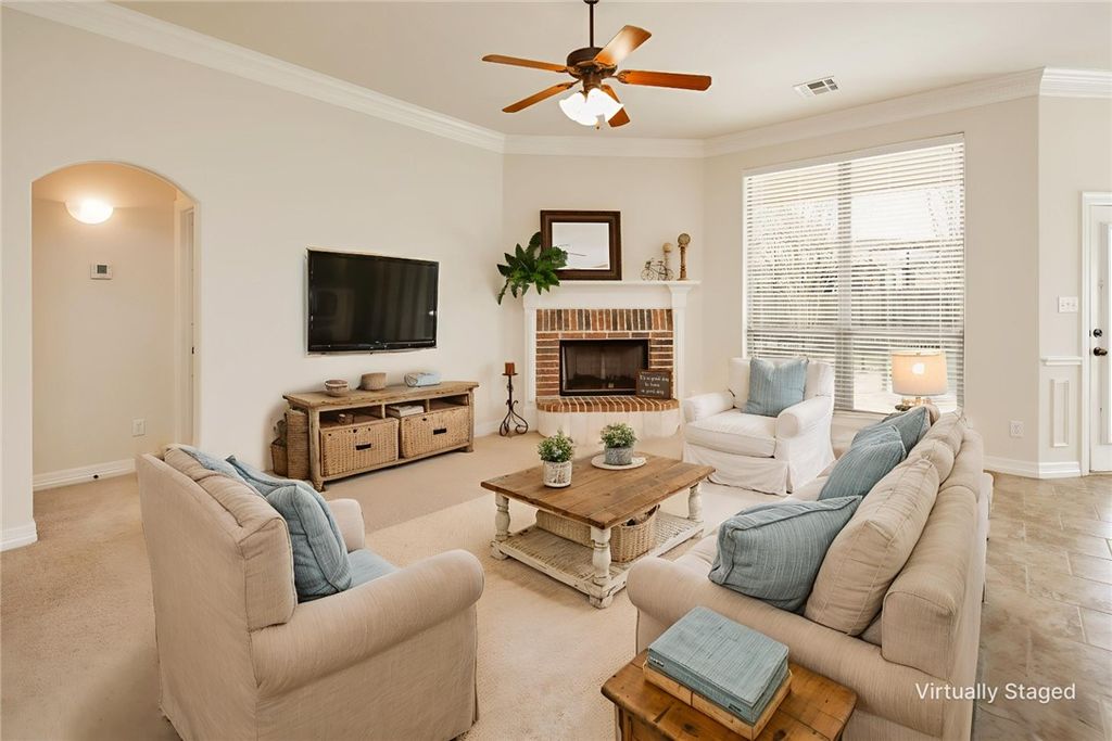 Enter this meticulously maintained home and be drawn to the living area with soaring ceilings, a custom fireplace, and windows overlooking the backyard that fill the space with natural light. The spacious kitchen features ample counter space, an eating bar, walk-in pantry, and abundant storage for easy meal prep. The primary suite is a private retreat at the back of the home. The en-suite bath offers dual sinks, a separate shower, linen closet, and large walk-in closet. A split floor plan places guest bedrooms at the front, separated by a full bath and additional hall linen storage. Two extra coat closets add to the home's impressive storage. The laundry room includes extra cabinetry and a hanging bar. Outside, the customs red-and-white brick facade stands out on a corner lot with two large oak trees shading the home in the evenings from the sun. The backyard is cool in the evenings as the sun goes down in front of the home. Perfect layout for with a covered patio, brick-paver area for table and fire pit, raised planter box with trellis screening the electrical box, three large crêpe myrtle trees for privacy and beauty, and a large playset. A sprinkler system and full gutters add convenience. Fresh paint and professionally cleaned carpet make this home move-in ready. Enjoy a walkable location near all three grade-level schools, parks, trails, a basketball court, and green space.