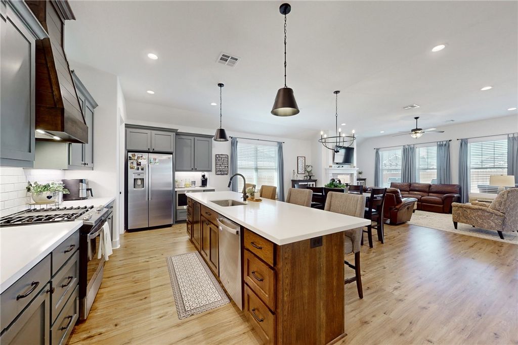 Beautifully maintained 3-bedroom, 2-bath home with a versatile bonus room featuring a closet that could be used as a fourth bedroom or home office. This move-in ready home offers an open floor plan with painted cabinets, gleaming quartz countertops, a classic white tile backsplash, stainless steel appliances, and a spacious kitchen island with bar seating and abundant counter space. The living room features a cozy fireplace and large windows that bring in plenty of natural light. The private primary suite includes a tiled shower, soaking tub, and a thoughtfully designed layout with the primary closet connecting directly to the laundry room. Enjoy outdoor living on the covered back porch with a gas stub-out, ideal for grilling. An oversized two-car garage with a bump-out provides extra storage or workspace. Very well cared for and in excellent condition, this home is truly move-in ready.