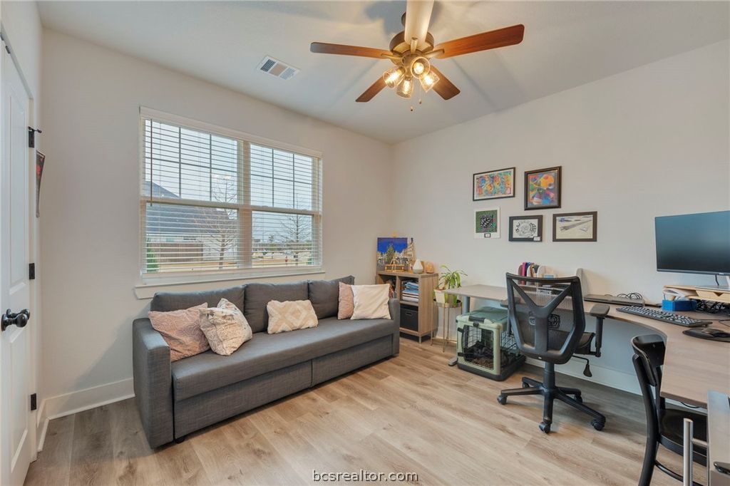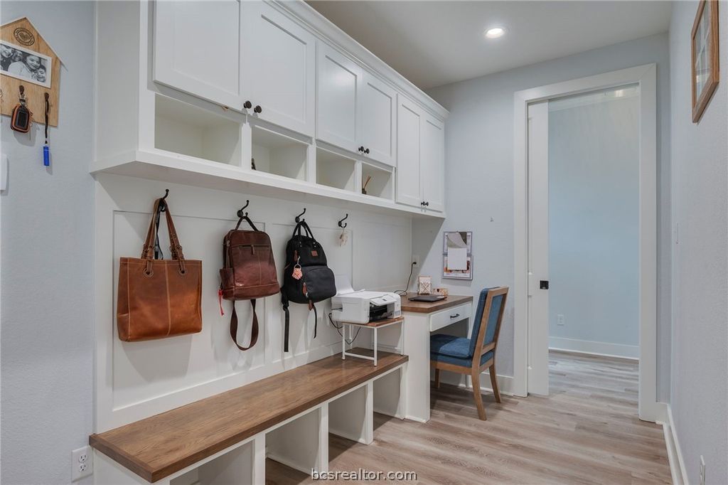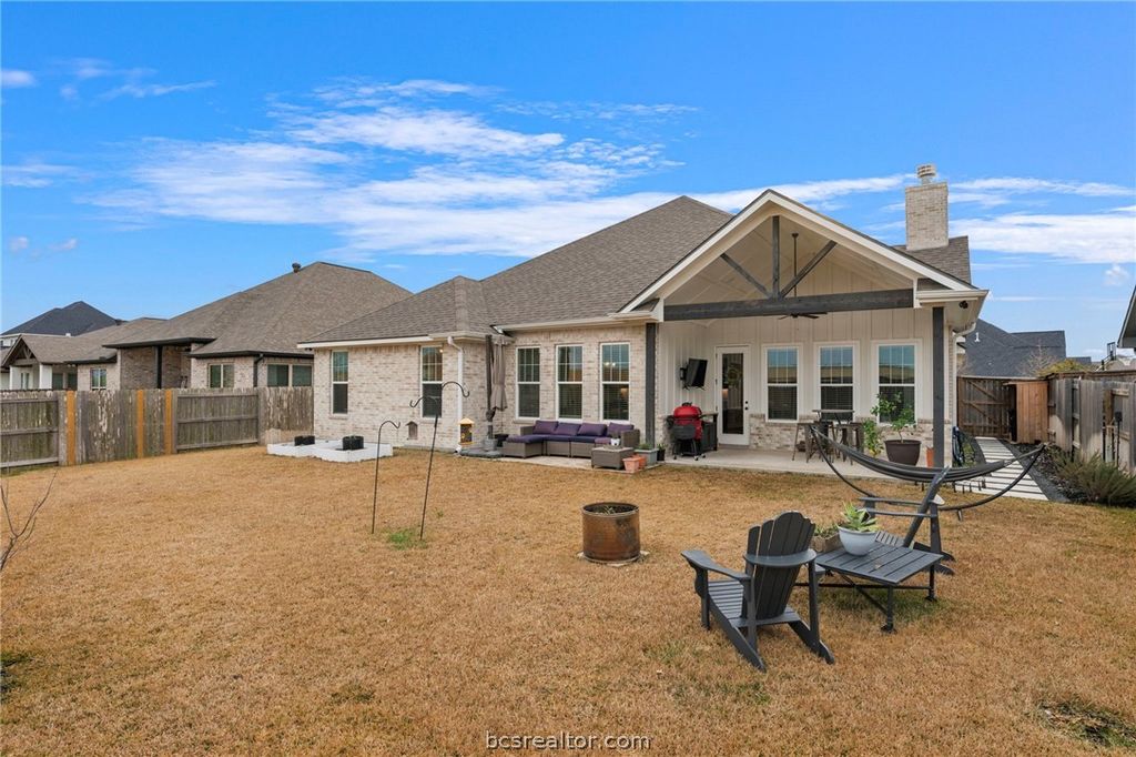 Beautifully maintained 2022-built home in the highly sought-after Mission Ranch community of College Station. This open-concept floor plan features a stunning vaulted ceiling in the living area, creating a bright and spacious atmosphere. The living room is anchored by a wood-burning fireplace with gas starter, and gas logs convey for added convenience. The well-appointed kitchen offers quality cabinetry, ample counter space, a central island, and a built-in mini fridge - perfect for entertaining or additional beverage storage. Just off the garage entry, a convenient mud room provides functional everyday organization and added storage. The private primary suite includes a well-designed en-suite bath and generous closet space. Enjoy added privacy with NO direct REAR NEIGHBORS - the home backs to a school property, offering open views and typically quiet evenings and weekends. The attic has been enhanced with added flooring for convenient storage and a safety railing for easy, secure access"”maximizing usable space. The covered patio and backyard provide a great space to relax or entertain. Located in Mission Ranch, residents enjoy premier amenities including a clubhouse, pool, lake, parks, and scenic walking trails, all just minutes from shopping, dining, and Texas A&M.