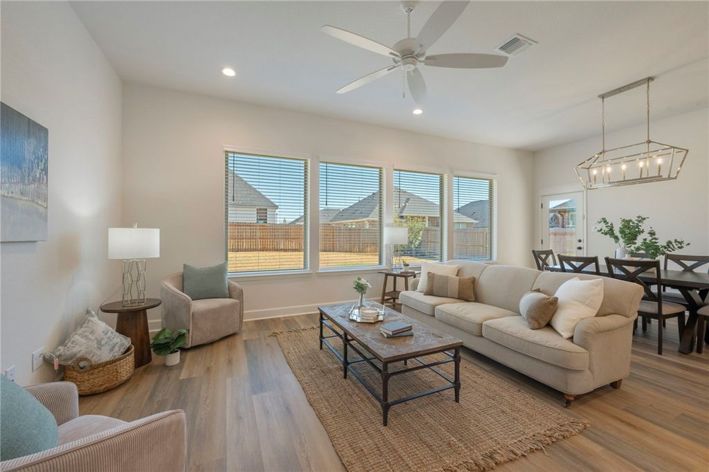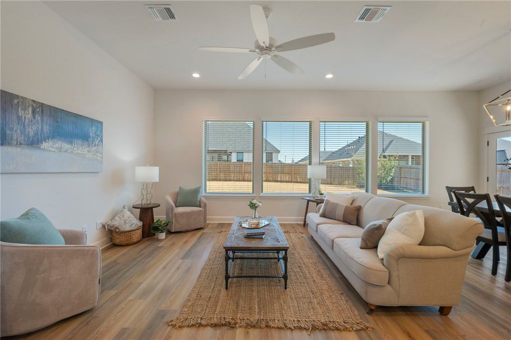 Discover refined living in the desirable Greenbrier neighborhood! This thoughtfully designed home offers 4 spacious bedrooms, a dedicated study, 2 bathrooms, and an expansive open-concept family room and dining area highlighted by four oversized windows that fill the space with natural light. The split-bedroom layout provides peace and privacy for all. The primary retreat features a generous walk-in shower and walk-in closet. Sparkling quartz countertops run throughout the home, while the main living spaces are finished in durable wood-look luxury vinyl plank flooring. The chef-inspired kitchen boasts a 5-burner gas range with built-in oven microwave, a walk-in corner pantry, and a large island with seating. Additional conveniences include a utility room with space for a secondary fridge or freezer. Neighborhood amenities include abundant sidewalks, a playground, and an outdoor adult exercise area. The location allows for east access to HWY 6, grocery stores, movies, and restaurants.