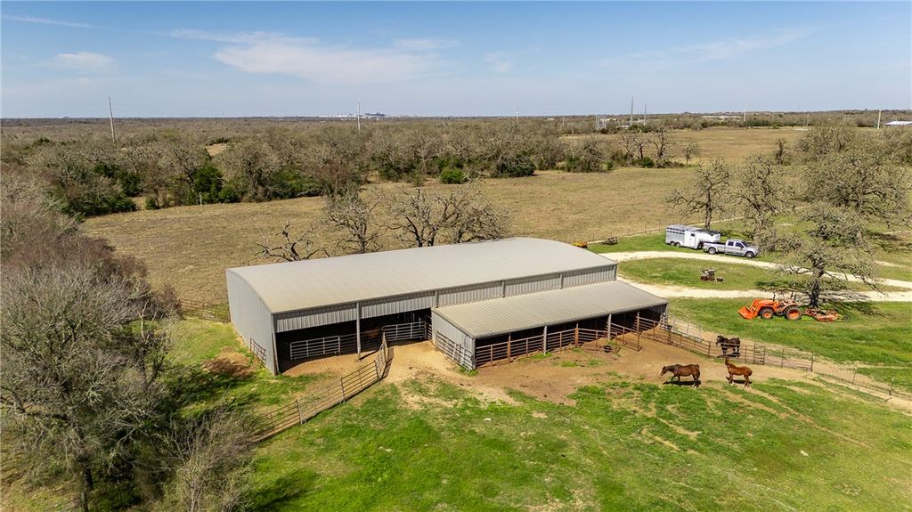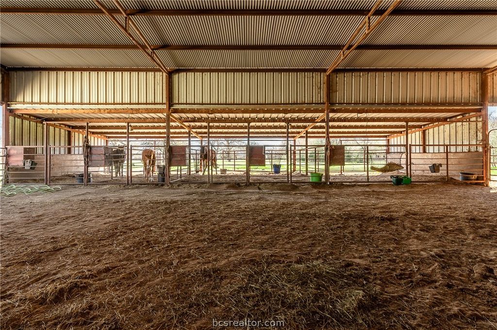 Private 12.7-acre horse property behind a gated entrance offering peaceful country living with versatile acreage. The property features a lighted 200x300 outdoor arena with pipe fencing, roping chutes, and a return alley, along with a large multipurpose barn that includes covered stalls and an enclosed riding area for use during inclement weather or flexible storage. Smooth cross-fencing divides the land into well-defined sections, separating the residence from the open acreage while maintaining privacy and usability. Mature trees throughout the property provide natural shade and enhance the peaceful setting. The all-electric home offers wood and tile flooring, granite and marble countertops, multiple living areas, and a spacious primary suite with outdoor access. Covered front and back porches and a tiled garage provide additional functional space. A rare opportunity to enjoy spacious acreage, versatile amenities and serene country living-just minutes from Texas A&M, shopping, dining and College Station.