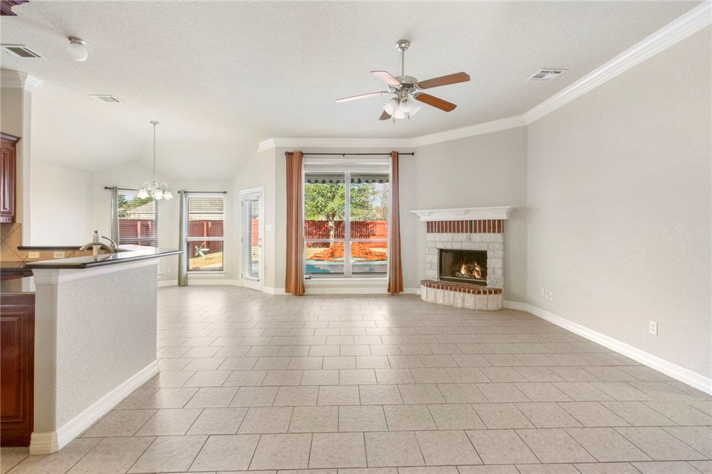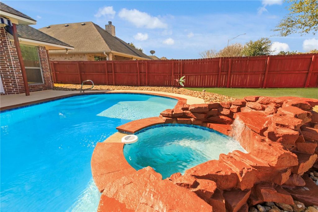 Backyard goals, delivered in deed-restricted Castlegate "” with a staycation-style backyard for under $375,000. This 3 bed, 2 bath, 1,668 sq ft College Station home for sale puts the spotlight where it belongs: a heated pool, hot tub with waterfall, and a SunSetter retractable awning that extends over about half the pool "” and yes, the pool, hot tub, and awning are all remote-controlled. Settle in with relaxing water sounds and real shade-on-demand for Texas summers. Inside, the open floor plan includes a fireplace and a dining area with bay windows. The kitchen features granite counters, an eating bar, dry bar, electric range, and a walk-in pantry. The primary suite offers solid-surface flooring, dual sinks, a walk-in closet, a soaker tub, and an updated tile shower. Notable updates include a new pool heater & filter (2024), two French drains, and a new roof (2025) with transferable warranty. Finished with a 2-car, front-entry garage, this Castlegate home is priced to make the pool life realistic "” not "someday."