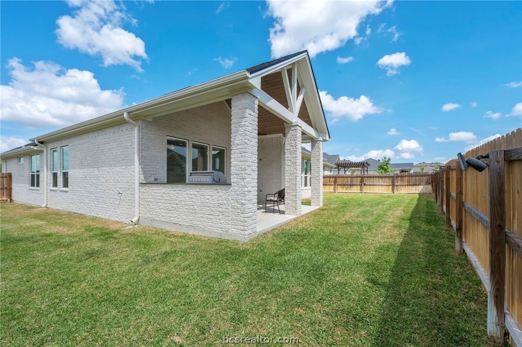 BEAUTIFUL LIKE-NEW home in the desirable neighborhood of Greenbrier - 4 bed + 2 bath + 3-car garage with extra wide driveway situated on a large corner lot. The open concept plan provides space for family and friends to gather everyday or for special occasions. The kitchen is a DREAM and boasts quartz countertops with crisp white soft-close cabinetry, stainless steel appliances, double ovens + microwave, a gas cooktop + vent fan, and an island-eating bar. There is an abundance of natural light throughout this well-arranged home. The spacious primary suite offers a generous space, including a sitting area, while the en-suite bath features a walk-in closet and a large Euro shower for luxury and comfort. Wonderful secondary bedrooms with easy-open door handles instead of knobs. Late-night laundry sessions won't bother anyone with this soundproof laundry room. Clean up and organization are a snap with the mudroom and a sink in the garage. Enjoy relaxing or eating outside under the covered patio with vaulted ceiling, a built-in outdoor grill and kitchen that overlooks the thick green lawn. Yard maintenance is a breeze with front/back yard irrigation system. Situated on a quiet corner lot on a cul-de-sac street, this haven is just minutes from the renovated Kroger center with nearby restaurants. Target, Lowe's and lots of shopping are nearby and you'll be just down the road from the future HEB!