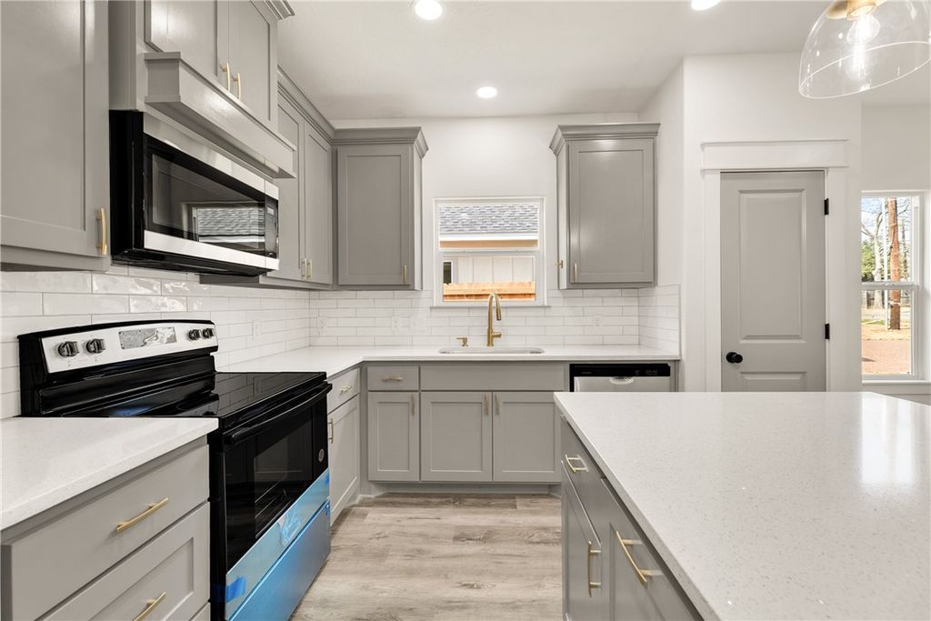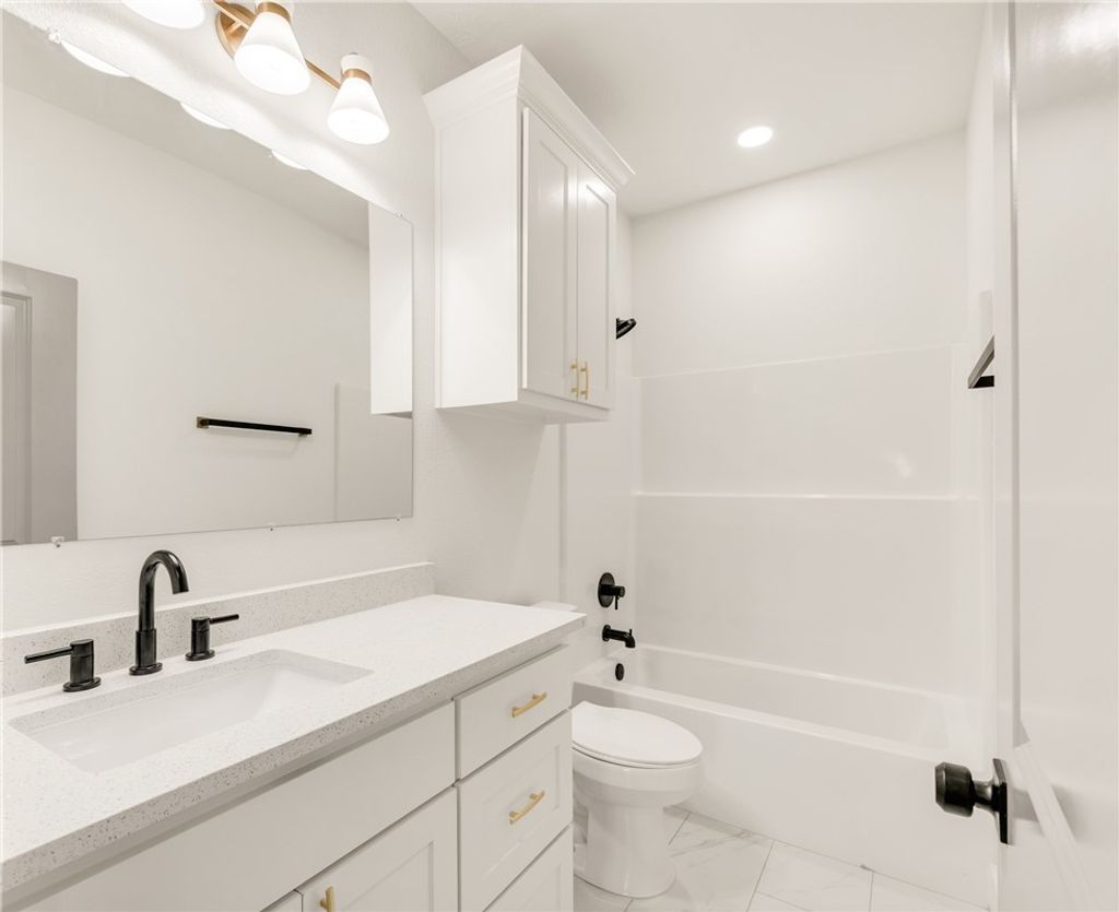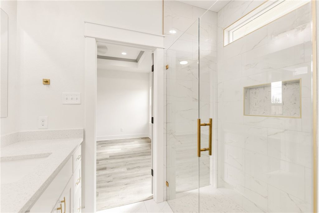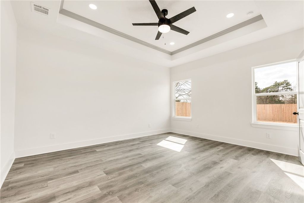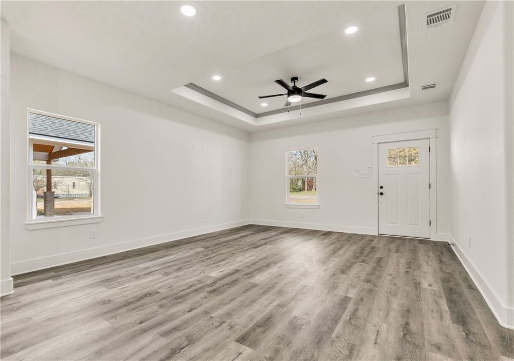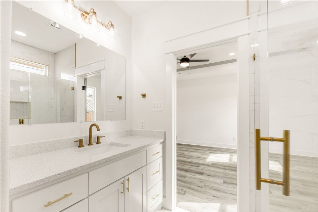 Beautiful new construction 3-bedroom, 2-bath home offering modern design and quality finishes throughout. The exterior features clean lines, soft-toned siding, brick accents, and a welcoming covered front porch that adds great curb appeal. Inside, you'll find a bright open-concept layout with tall ceilings, recessed lighting, and durable wood-look flooring in the main living areas. The kitchen is designed for both style and function with quartz countertops, custom cabinetry, subway tile backsplash, stainless steel appliances, a spacious island, and elegant gold hardware and fixtures. The living and dining areas flow seamlessly, creating an ideal space for everyday living and entertaining. The primary suite includes dual sinks, quartz counters, and a beautifully tiled walk-in shower with gold accents. Secondary bedrooms are generously sized and share a well-appointed bathroom with modern finishes. The laundry room is also finished with beautiful tile, adding both durability and thoughtful detail. Enjoy a fully fenced backyard with plenty of space to relax or entertain, along with a long driveway providing ample parking. Conveniently located near Downtown Bryan, Texas A&M University, shopping, dining, and local coffee shops, this move-in ready home offers comfort, style, and convenience in one complete package!
