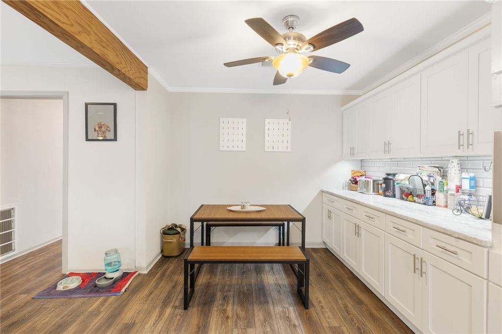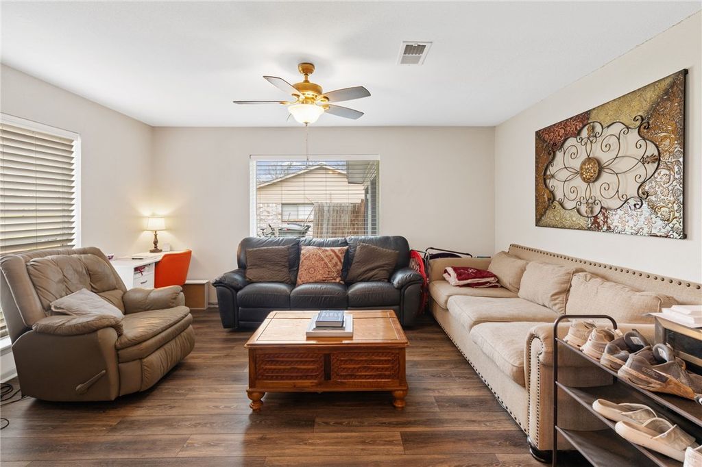 Welcome to this updated 4-bedroom, 3-bath home featuring an open-concept living and kitchen area with vaulted, beamed ceilings and durable flooring throughout (no carpet). The kitchen offers granite countertops, stainless steel appliances, subway tile backsplash, floating shelves, and ample cabinet and counter space. The primary bedroom includes multiple windows overlooking the backyard and an en-suite bathroom with a walk-in shower. Secondary bedrooms provide generous closet space and flexibility for a variety of uses. A fenced backyard with patio space offers room to relax or entertain. Conveniently located near campus, shopping, dining, and major roadways. Schedule a showing today!