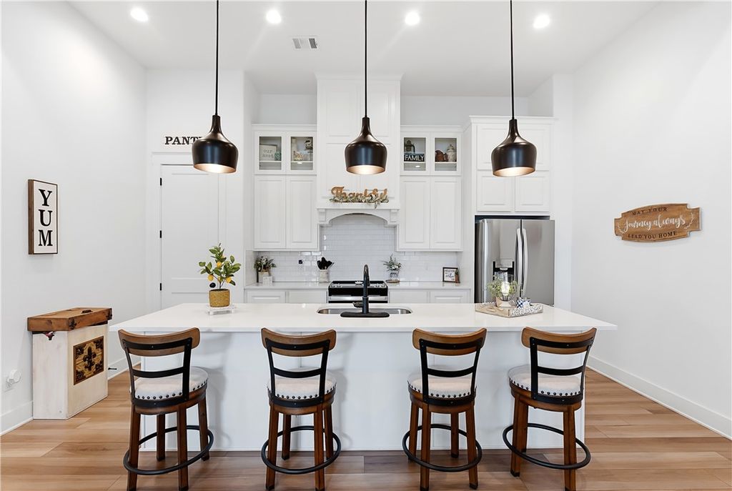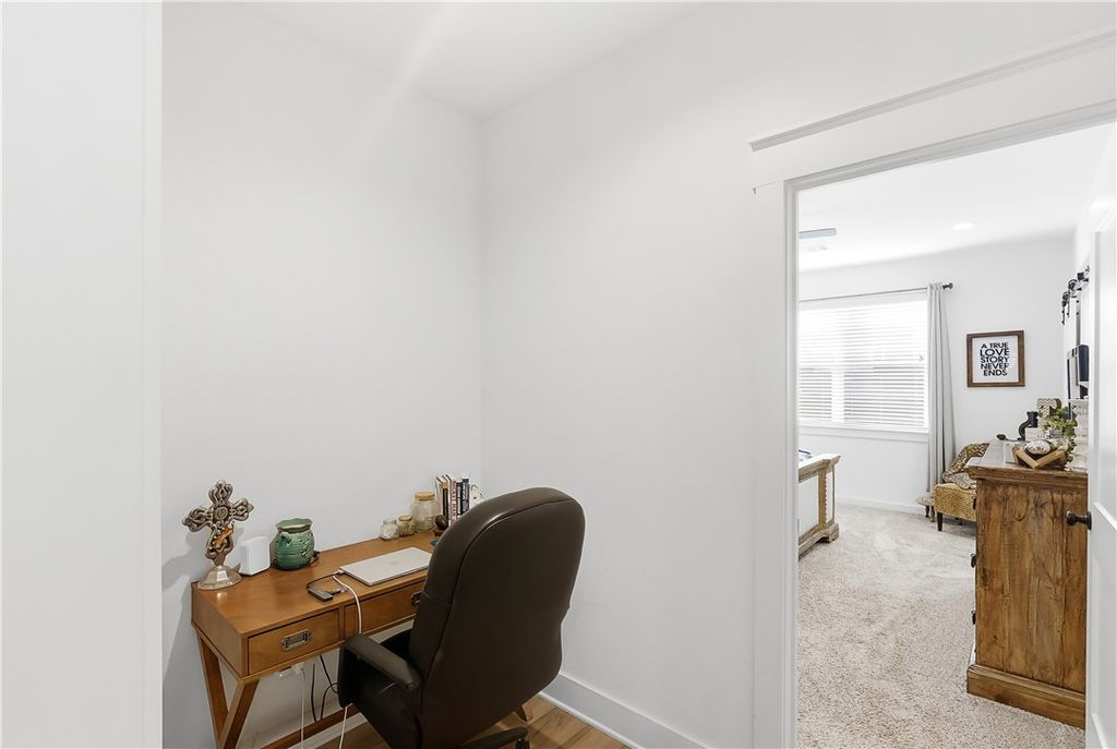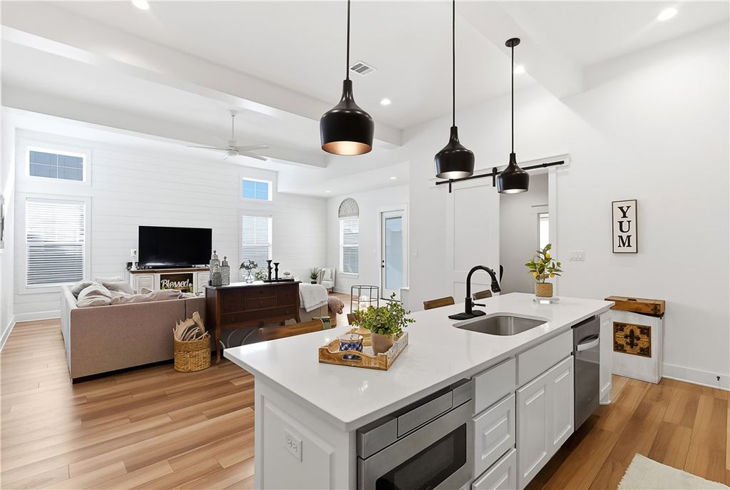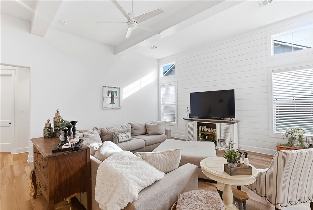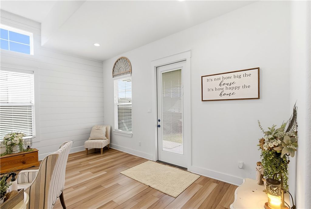 This immaculate, one-owner townhome blends modern farmhouse charm with easy, low-maintenance living in the amenity-rich Oakmont community. Perfect as a full-time residence or lock-and-leave option, this home offers raised ceilings, abundant natural light, and an inviting open layout. The living area flows seamlessly into the kitchen where a large island anchors the space, ideal for casual meals or entertaining. Cabinets extend to the ceiling for added storage and a clean, finished look. The split floor plan provides privacy and flexibility, with a transitional space off the kitchen that works perfectly as a reading nook or small workspace before leading into the spacious primary suite. The ensuite bath features a double vanity, soaking tub, glass walk-in shower, and generous storage. Practical details make daily living simple, including a well-appointed laundry room just off the two-car garage with built-in cabinetry, open shelving, a hanging rod, and a utility sink. Enjoy the covered patio and fully fenced backyard, with added privacy thanks to its end-unit position. HOA maintains the yard, allowing more time to enjoy Oakmont's pools, parks, and walking trails. Beautifully maintained and truly move-in ready, this home offers comfort, style, and effortless living.