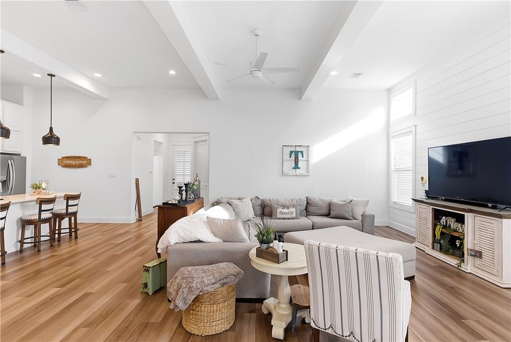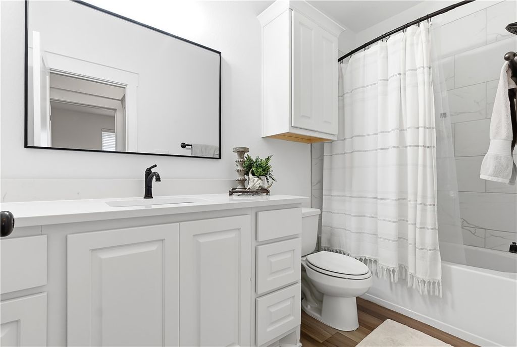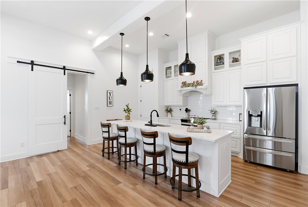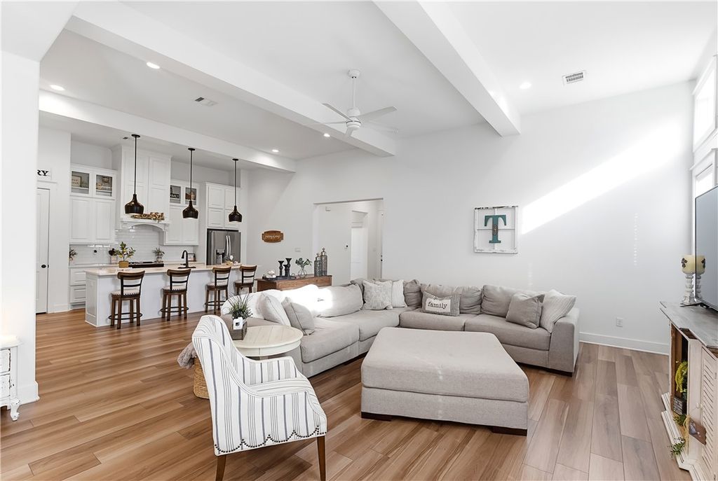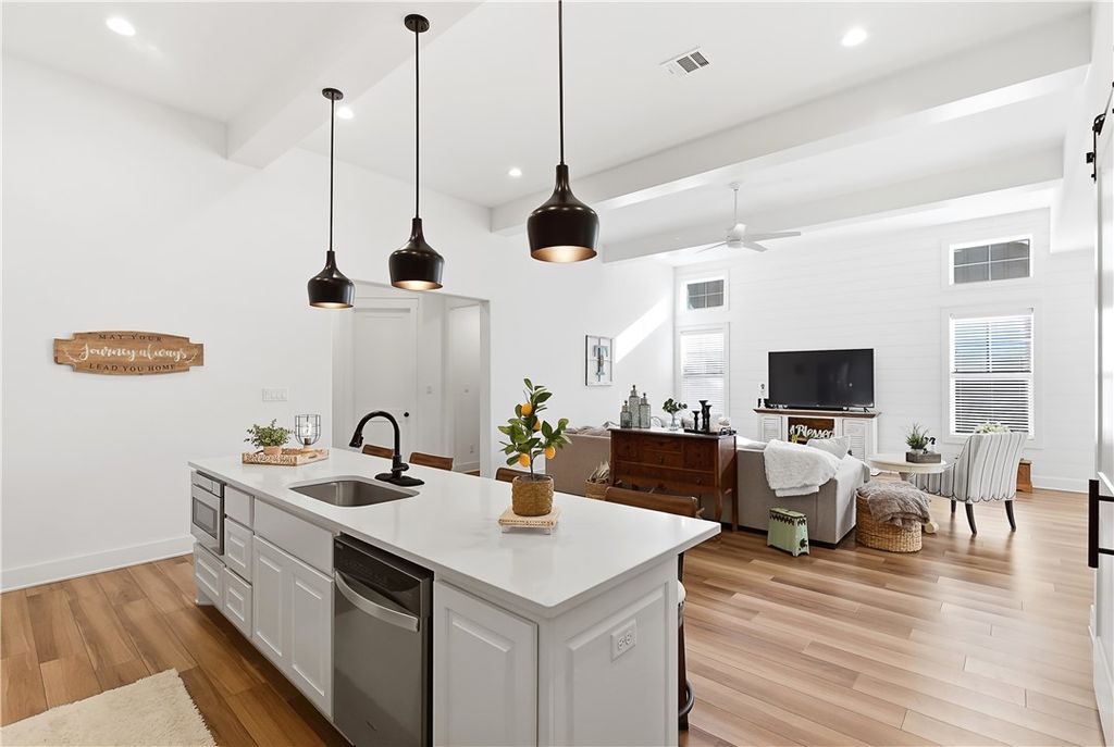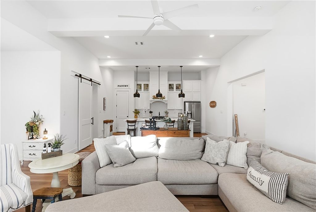 This immaculate, one-owner townhome blends modern farmhouse charm with easy, low-maintenance living in the amenity-rich Oakmont community. Perfect as a full-time residence or lock-and-leave option, this home offers raised ceilings, abundant natural light, and an inviting open layout. The living area flows seamlessly into the kitchen where a large island anchors the space, ideal for casual meals or entertaining. Cabinets extend to the ceiling for added storage and a clean, finished look. The split floor plan provides privacy and flexibility, with a transitional space off the kitchen that works perfectly as a reading nook or small workspace before leading into the spacious primary suite. The ensuite bath features a double vanity, soaking tub, glass walk-in shower, and generous storage. Practical details make daily living simple, including a well-appointed laundry room just off the two-car garage with built-in cabinetry, open shelving, a hanging rod, and a utility sink. Enjoy the covered patio and fully fenced backyard, with added privacy thanks to its end-unit position. HOA maintains the yard, allowing more time to enjoy Oakmont's pools, parks, and walking trails. Beautifully maintained and truly move-in ready, this home offers comfort, style, and effortless living.