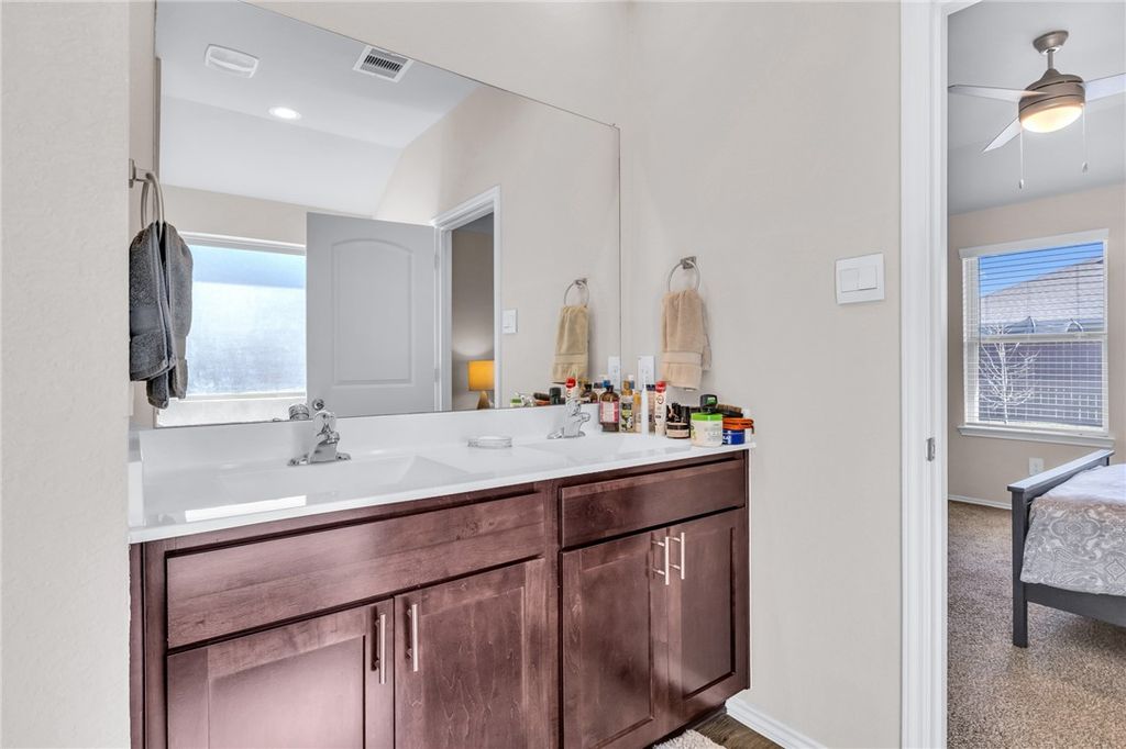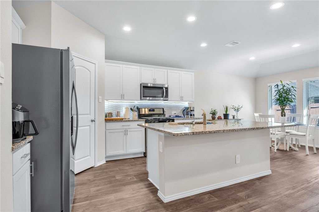Do Not Miss This Opportunity to Own A Beautifully Maintained Home with All The Extras. This 2021 Built 3 Bed, 2 Bath Home Feels Brand New. It is Wired With Smart Home Features as Well as 6 Cameras Plus The Safe Haven Doorbell Camera Which will Convey. Tiled Entry Way and Tiled/Covered Back Patio with Pergola are Just a Few of the Additions. Kitchen Backsplash and Cabinet Handles have been Updated, and Under Cabinet Lights Were Added. Ceiling Fans Are Updated, Shelving and Extra Storage have Been added to the Laundry Room, Closets and Bathrooms Throughout the Home. Kitchen Has A Granite Island, and Bathrooms Are Quartz Counters, with Double Sinks in the Primary Bath as well as Soaking Tub and Separate Shower. Water Heater is Tankless, and Garage has been Updated with Epoxy Floor and Added Baseboards. Stone & Brick Front with Beautiful Landscaping, Storage Building, and Gutters In Place Make this Home Hard to Beat. Adjacent to Carl Barton Park, and Trails. Schedule Your Tour Today!