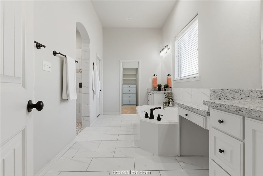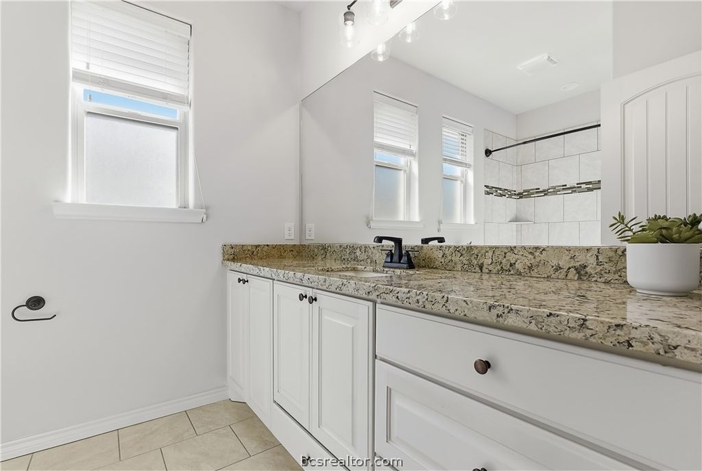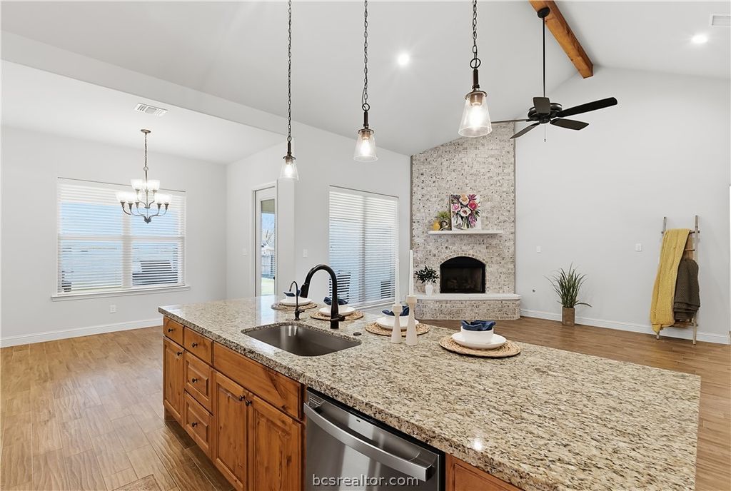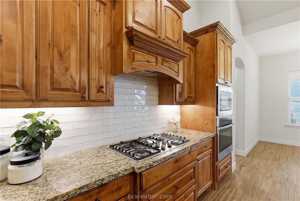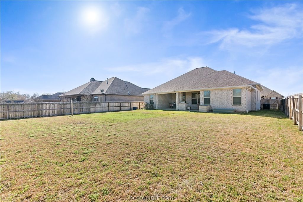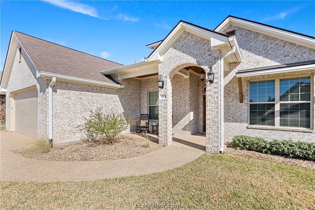 Discover the perfect blend of comfort and style in this beautifully designed 3-bedroom, 2.5-bath home located in the heart of Bryan, TX. A picturesque property featuring a 2-car garage and a variety of luxurious touches sure to impress. Step inside to a home that boasts an open living space enhanced by vaulted ceilings and a striking floor-to-ceiling brick fireplace. The oversized kitchen island is a chef's delight, complemented by custom alder cabinetry and an eat-in bar for casual gatherings. A dedicated dining space is perfect for more formal occasions. The barrel brick ceiling entryway adds a distinctive touch, setting the stage for elegance as you enter. The spacious primary suite is a serene retreat with its large walk-in shower, separate soaking tub, and double vanities. The walk-in closet conveniently connects to the laundry room, adding an element of practicality to your daily routine. An additional bonus room or office, along with a hallway desk for extra study space, offers flexibility for your lifestyle needs. Outside, enjoy a large backyard complete with a covered patio and side outdoor kitchen, perfect for entertaining guests or relaxing. The home features a sprinkler system for easy maintenance and its covered front porch invites you to enjoy quiet moments in this charming neighborhood. Experience the ease and elegance of living in this stunning Bryan residence, where every detail has been carefully considered for your comfort and enjoyment.