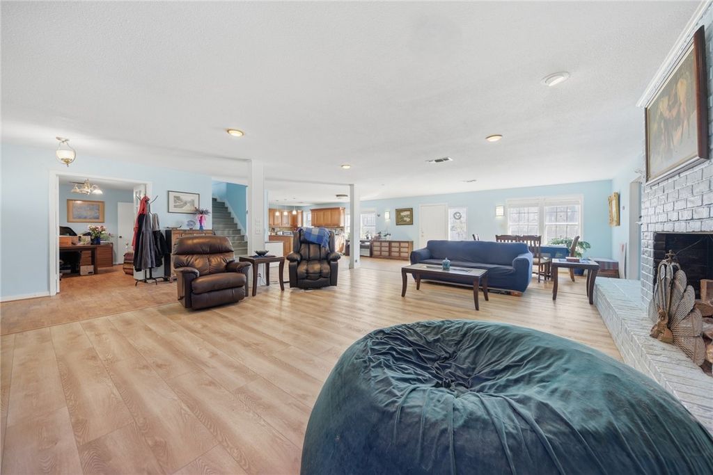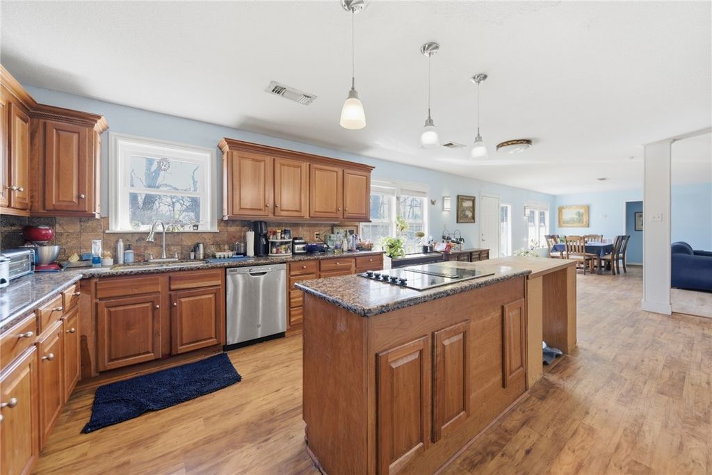 Set on a serene, square, and fully fenced 10 acres in Hempstead, this property includes a 3,200+ SF main home with welcoming porches, a 420 SF guest cottage, and multiple barns, ready to become a true country homestead. The main home features an open, bright first floor with connected kitchen, living, and dining areas. The kitchen offers ample counter space and cabinetry, and a functional layout with room to update. A primary bedroom addition and dedicated office are also downstairs while one bedroom with an en suite bathroom, plus two additional bedrooms and a full bathroom are located upstairs. The 2016 guest cottage offers one bedroom, a full bath, kitchen, and loft space. A circle drive connects all improvements, including a large metal barn, a smaller metal barn, solar panels to help reduce electricity costs, an above-ground pool ready for a new deck and liner, and a water purification system for the well. The acreage is a mix of woods and pasture, supporting abundant wildlife.