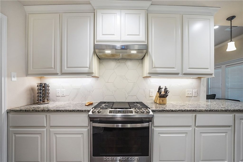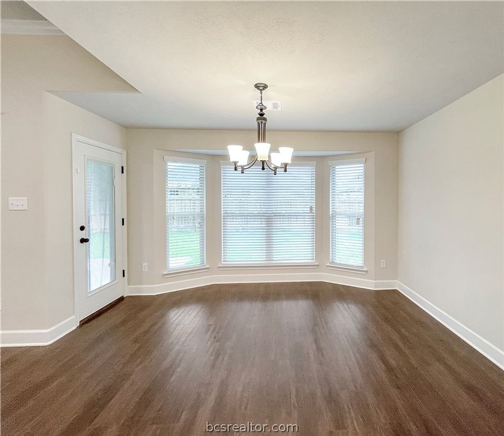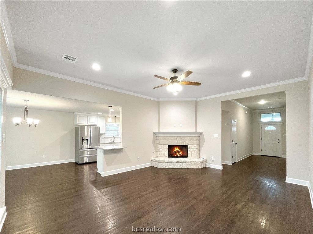 This well-maintained 4-bedroom, 2-bathroom home in Dove Crossing offers 2,097 square feet of thoughtfully designed living space with an open concept layout, tray ceilings, and crown molding throughout. Vinyl plank flooring runs through the main living areas, anchored by a floor-to-ceiling stone fireplace with gas start. The kitchen is well-equipped with granite countertops, a walk-in pantry, breakfast bar, and stainless appliances. The primary suite features double sinks, a soaking tub, separate walk-in shower, and a large walk-in closet. Outside, the home is wrapped in full brick construction, features a wide driveway, and an extended back patio with a fully fenced yard. Located centrally in College Station, Dove Crossing puts you close to parks, Baylor Scott & White Medical Center, HEB, Kroger, and a variety of shopping and dining options.