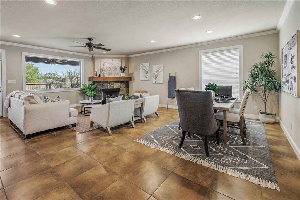 Located on a quiet cul-de-sac, this Pitcock and Croix designed home provides a unique and functional floor plan and a private back yard with no rear neighbors. The spacious living and dining rooms are open to the kitchen and enjoy views of the neighborhood park from the large picture window adjacent to the beautiful slate fireplace. The intentional design of the living room and dining room creates a space that is ideal for hosting everything from intimate dinners to festive celebrations. A large, functional kitchen continues the story with rich cabinetry, deep granite countertops, a central island, and an abundance of workspace. Nearby, a bright breakfast nook with a large window creates a cheerful spot for morning coffee or casual meals. Tucked away for added privacy, the primary suite offers a true sense of retreat with a spacious bath featuring a soaking tub, separate shower, dual vanities, and two walk-in closets. The split-bedroom plan provides privacy for both the master bedroom and the two guest bedrooms. Unwind under the covered patio or attractive brick patio extension and enjoy views of the inviting, low-maintenance backyard and community park. Ideally located near the community pool and park and near shopping, dining, and everyday conveniences, this home blends thoughtful design with a desirable setting.
