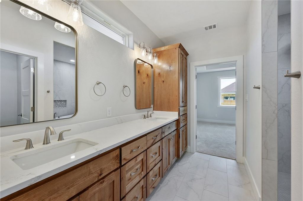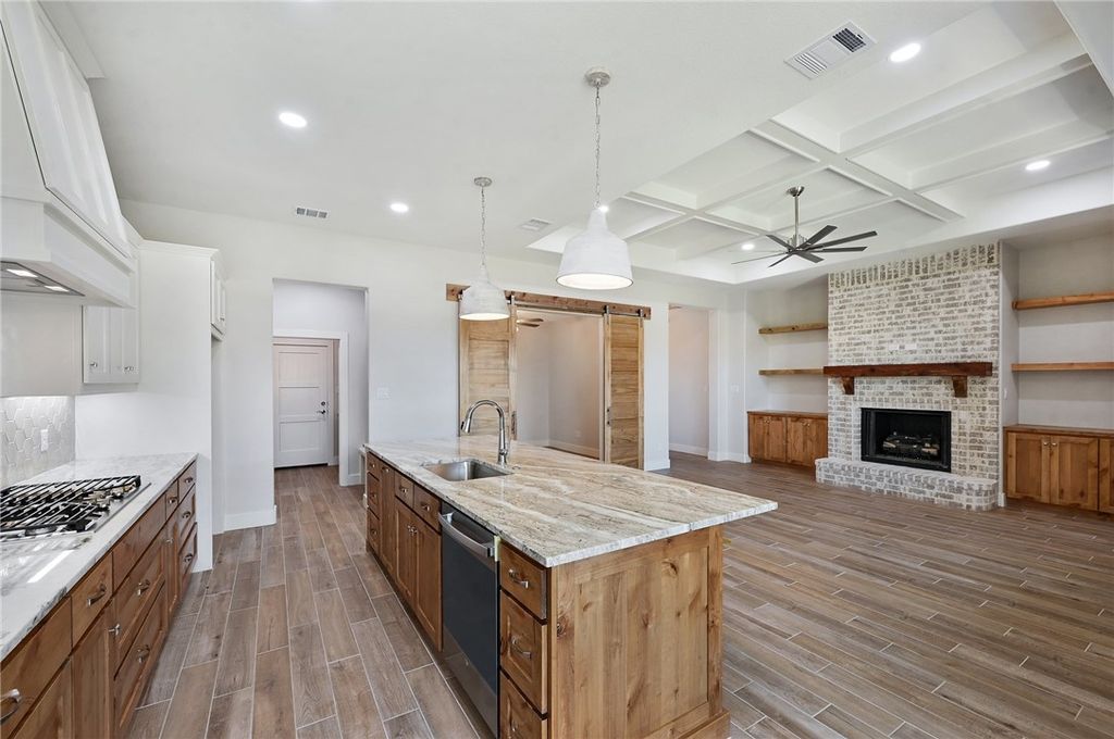 Nestled in the desirable Austin's Colony neighborhood, this well-appointed Creekview Custom Builders home offers 3 bedrooms, 2 bathrooms, and a dedicated study. Step inside to find an open-concept layout where wood-look tile flows seamlessly through the entry, living, kitchen, dining, and study. The kitchen is designed for everyday living and entertaining, featuring a spacious working island, large pantry, stainless steel appliances, and a gas range. The living room is anchored by a centered fireplace with built-in shelving, creating a warm and inviting focal point. Privately tucked at the back of the home, the primary suite offers a spa-inspired ensuite. The ensuite boasts dual sinks, a wet room with a stunning stand-alone soaking tub, a large walk-in shower, and a generous walk-in closet. Designer touches throughout include quartz countertops, modern lighting, and stained beams highlighting the entry and living area. Quality features include a 16 SEER HVAC system, tankless water heater, media panel, and pre-wired for security. Ask your REALTOR for the full list of upgrades. Builder offering $4,000 your way towards closing costs, rate buy down, or upgrades to the home. STOCK PHOTOS OF A HOME WITH THE SAME FLOORPLAN BEING USED. FINAL SELECTIONS WILL DIFFER FROM STOCK PHOTOS.