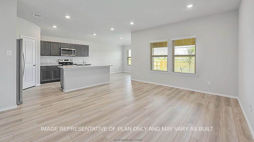 Introducing the Fargo floorplan at Grand Lake in Snook, Texas. This 4-bedroom, 2-bathroom home features approximately 1,665 square feet of living space. Walking through the front door, you're met with the first two secondary bedrooms with a shared landing space to the secondary bathroom. Each secondary bedrooms contains carpeted flooring and walk-in closets. The bathroom includes a shower/tub combo and a quartz vanity top. Continuing through the entry, you'll find the third secondary bedroom along with a hall closet. Opposite to this bedroom is the utility room with garage access. Past this space is the open-concept kitchen, living, and dining areas. The kitchen is complete with granite or quartz countertops, stainless-steel appliances, and a spacious corner pantry. There is also an island great for hosting. Off the breakfast nook, is the back door to the covered patio and fenced backyard. Lastly, you'll find the large primary bedroom through the living room. This bedroom has plenty of natural light with two windows to the backyard. It also has an attached bathroom, with a ceramic tile surround shower and vanity. You'll always have plenty of storage space with not only a huge walk-in closet, but separate linen shelving as well.