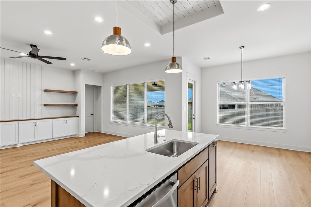 Discover a blend of comfort and luxury in this meticulously designed 3-bedroom, 3-bathroom NEW CONSTRUCTION residence nestled in Austin's Colony. With a side entry 2-car garage on an enviable corner lot, this home stands out with its full brick exterior, offering both durability and timeless appeal. Step inside to a light-filled sanctuary where expansive windows and included blinds create a bright and airy ambiance. The open floor plan seamlessly connects the main living areas, adorned with luxury vinyl plank flooring and thoughtful built-ins. The living room's generous space is ideal for relaxation or hosting gatherings. Culinary enthusiasts will find delight in the gourmet kitchen, boasting stainless steel appliances, an upgraded full backsplash, and custom cabinets. The kitchen's elegance is matched only by its functionality, offering ample storage and preparation space. Each of the three bathrooms features upgraded tile surrounds, ensuring a touch of luxury and style. The primary suite is a true retreat, offering a spacious layout with a well-appointed en-suite bath. Outdoor living is enhanced by the covered back patio, providing a perfect space for entertaining or simply enjoying a quiet evening. The property's thoughtful design and high-end finishes make it a standout choice for those seeking a blend of modern amenities and classic charm.