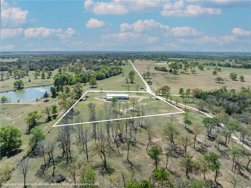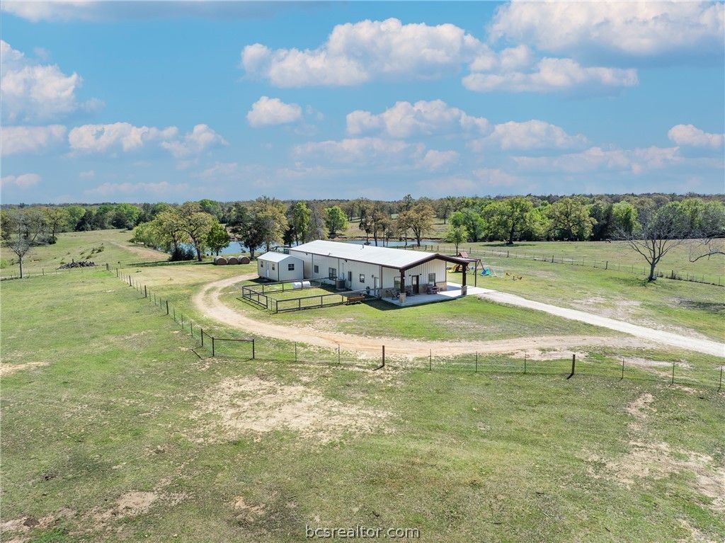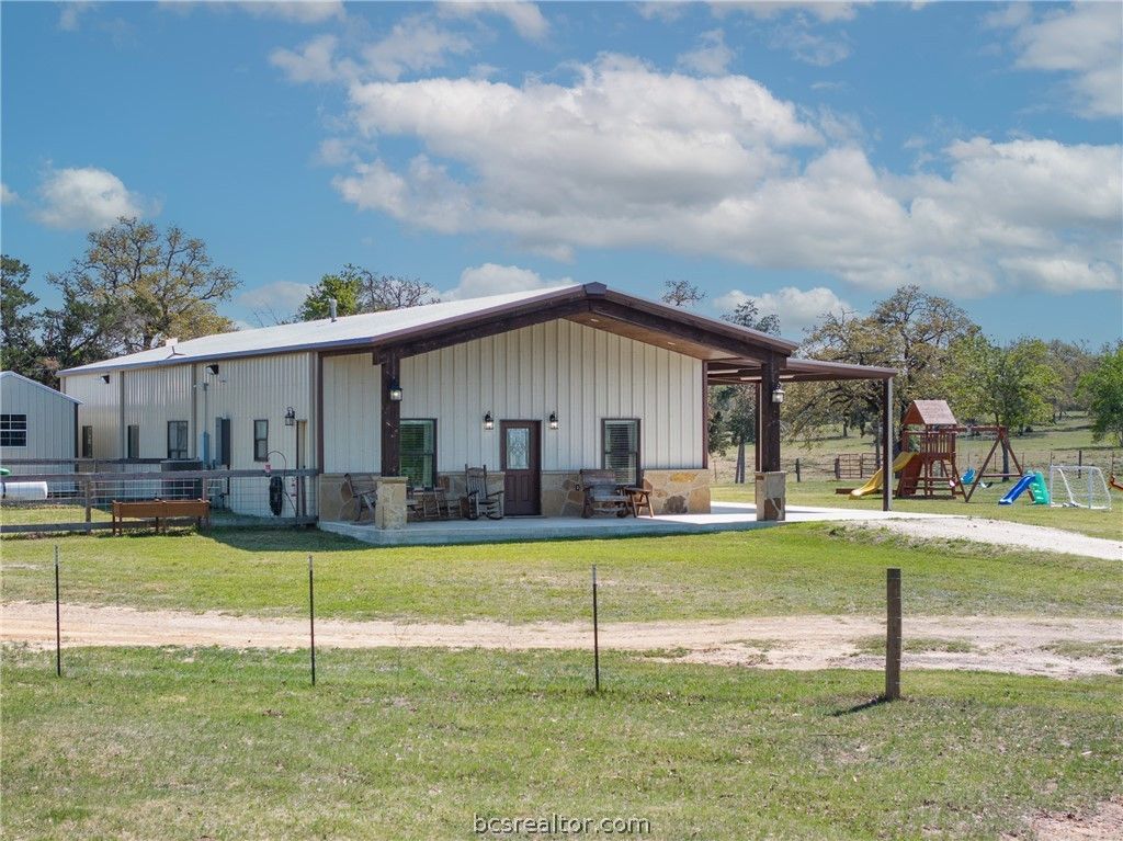 Beautiful 4-bedroom, 3-bath barndominium built in 2021, set on 3.48 scenic acres with breathtaking views. This spacious home offers the perfect blend of modern comfort and peaceful country living, all just 20 minutes from Bryan-College Station. Inside, you'll find an open floor plan connecting the kitchen, dining, and living areas"”ideal for entertaining and everyday family life. In addition to the four bedrooms, the home features a dedicated office and an extra playroom or bonus space, providing flexibility for work, hobbies, or a growing family. Step outside and enjoy the covered area that runs the full length of the building"”perfect for parking, relaxing, or taking in the beautiful surroundings year-round. This property offers plenty of room to live, grow, and enjoy the outdoors.