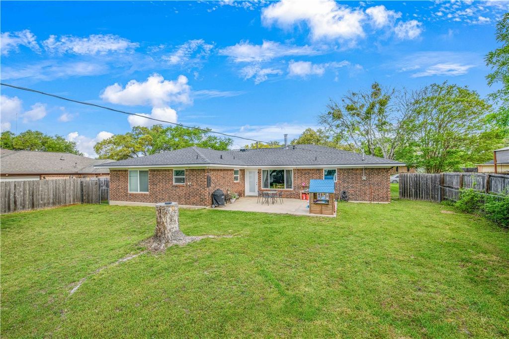 Charming and ideally situated, this well-maintained home offers an exceptional combination of space, comfort, and convenience. Upon entry, you are welcomed by a generous living area and an inviting, functional layout designed for everyday living. Positioned on a large lot, the property features an expansive backyard that provides ample space for outdoor enjoyment. Its prime location offers close proximity to major medical facilities, retail shopping, dining, and local attractions. The kitchen is light and bright, appointed with granite countertops and crisp white cabinetry, creating a clean and timeless aesthetic. Adjacent to the kitchen, a functional laundry room with additional storage provides direct access to the two-car garage for added convenience. All three bedrooms are generously sized and filled with natural light, while both bathrooms feature updated tilework and cabinetry. The private backyard is enhanced by mature trees and a patio area, making it ideal for both relaxing and entertaining. Additional highlights include a brand-new roof, offering peace of mind for years to come. Conveniently located just blocks from Tanglewood Park & Splash Pad and near schools, shopping, and restaurants, the home is centrally positioned between Texas A&M and Blinn College, with easy access to Briarcrest Drive, Highway 6, and Texas Avenue.