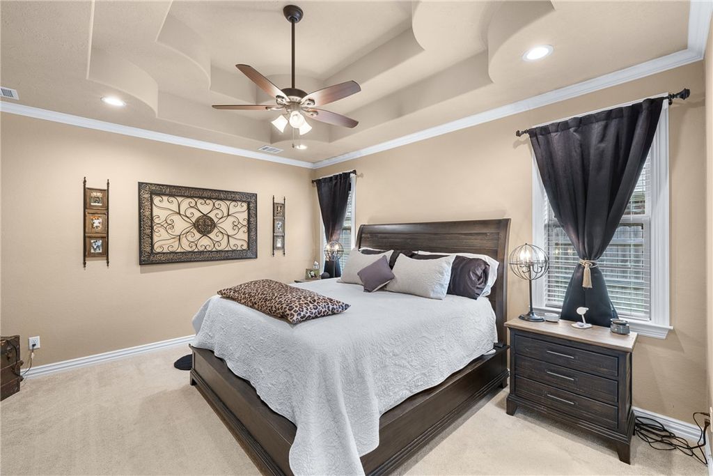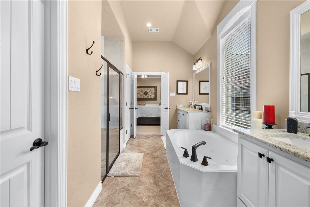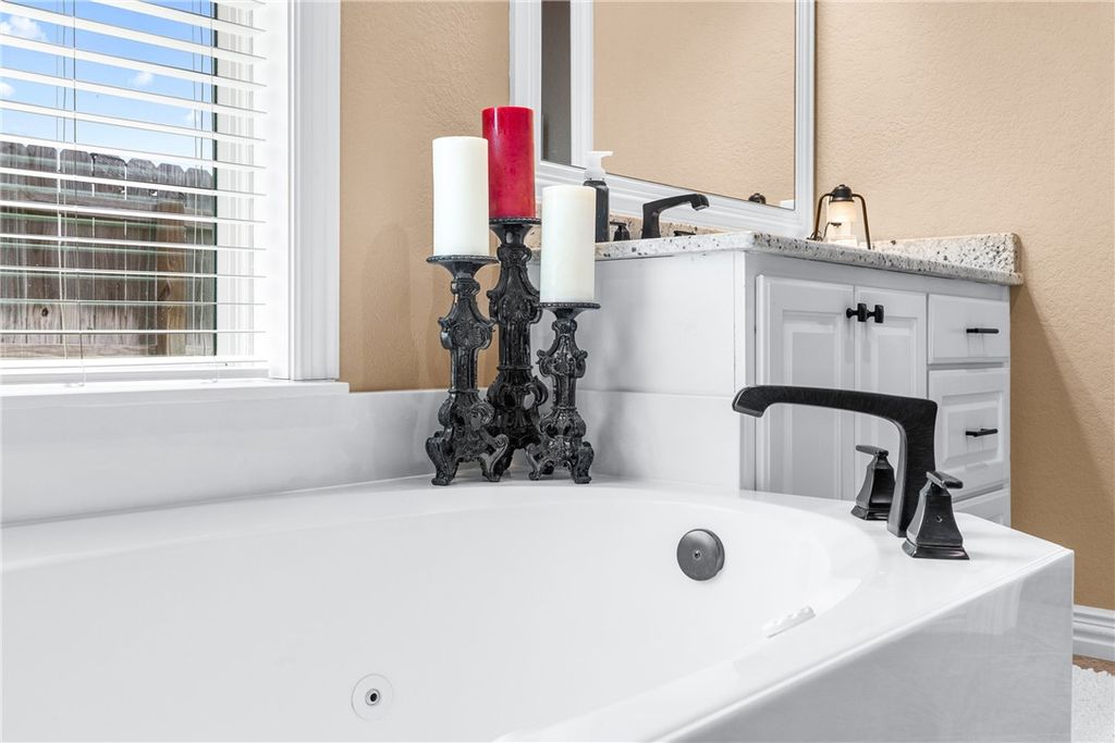 Welcome to 3057 Peterson Circle, an exceptional Trinity Builders home on a corner lot in Bryan, TX. Built in 2018, this move-in ready 3-bedroom, 2-bath home offers 2,016 sqft with a custom open-concept split floorplan. The living room features 12-ft ceilings, while the dining area offers 10-ft ceilings, creating a bright, spacious feel. The kitchen flows seamlessly into the main living areas, ideal for everyday living and entertaining. The private primary suite includes a 42x60in cultured marble jetted tub, separate tile shower with bench seating, and a custom walk-in closet. With 9-ft ceilings throughout, a side-entry garage, and quick access to Highway 6, Villa Maria, William J. Bryan, and Blinn College, and a few minutes away from Texas A&M campus. This home blends comfort, quality, and convenience.
