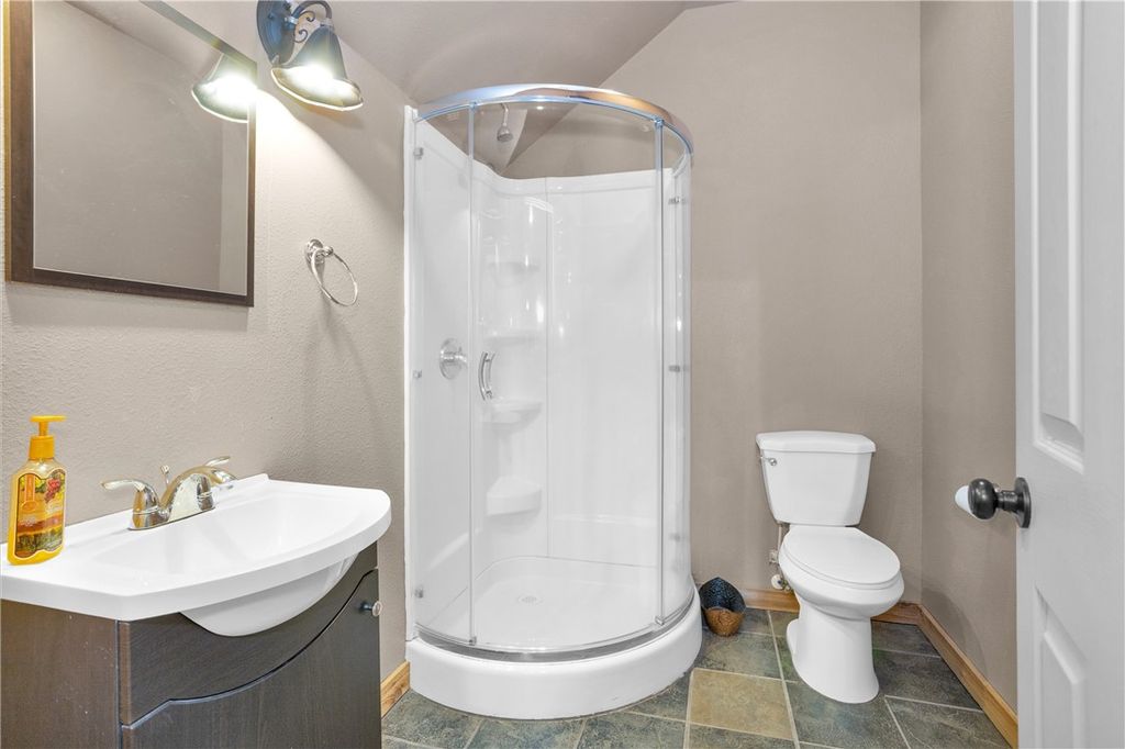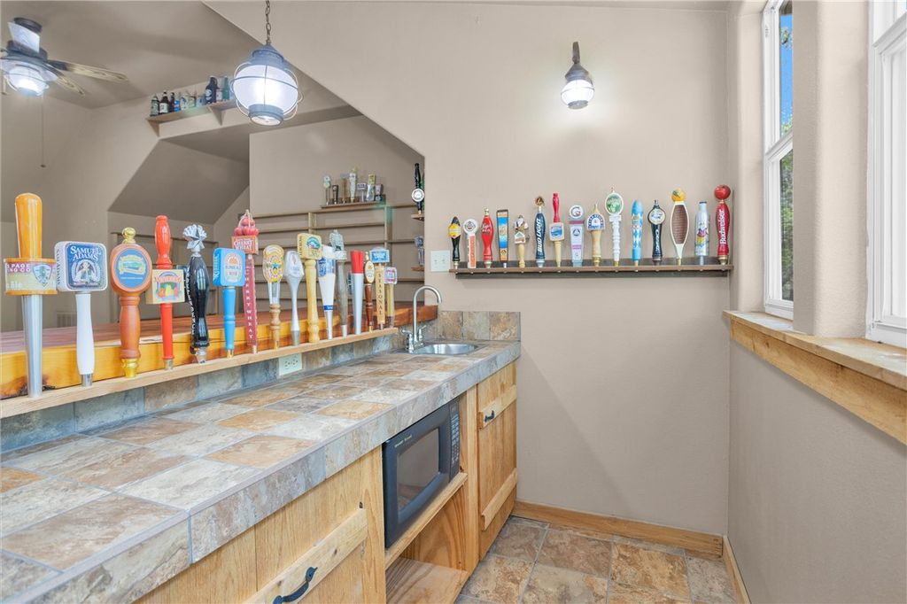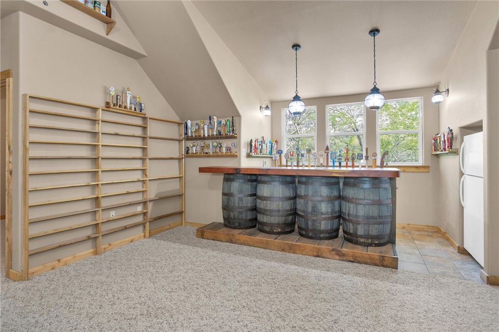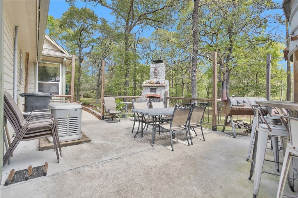 Tucked away behind a peaceful wooded setting, this private country retreat! Designed with efficiency in mind, features Tech-Shield radiant barrier, Pex-plumbing, dual distribution manifolds, whole-house Generac 20KW generator. Spacious kitchen with quartz countertops, a 36" 5-burner gas cook-top, built-in electric oven, and an oversized island. The breakfast area with custom built-ins/desk space, home is filled with thoughtful details like stained-glass transoms, and abundant storage. The primary suite offers a whirlpool tub, marble countertops, custom closet built-ins, and added soundproofing for privacy. Game room that includes a kitchenette, custom bar, full bath, and a bonus room. Large concrete patio featuring a corner wood-burning fireplace, a unique grain bin BBQ hut with bar and utilities, and ample parking space. The property is equipped with RV covered parking (30-amp service), multiple attic storage areas, and a spacious portico that can accommodate multiple vehicles.