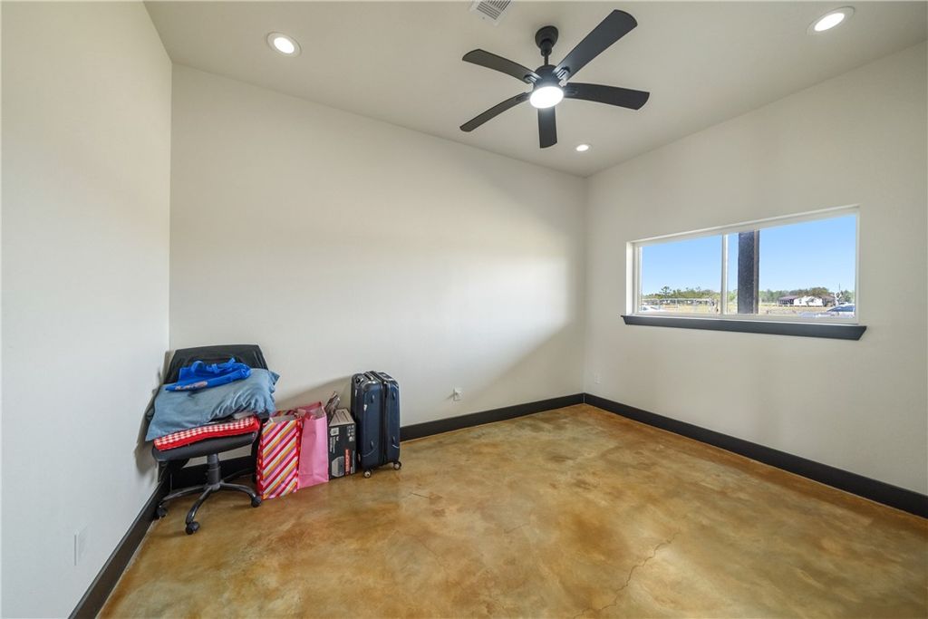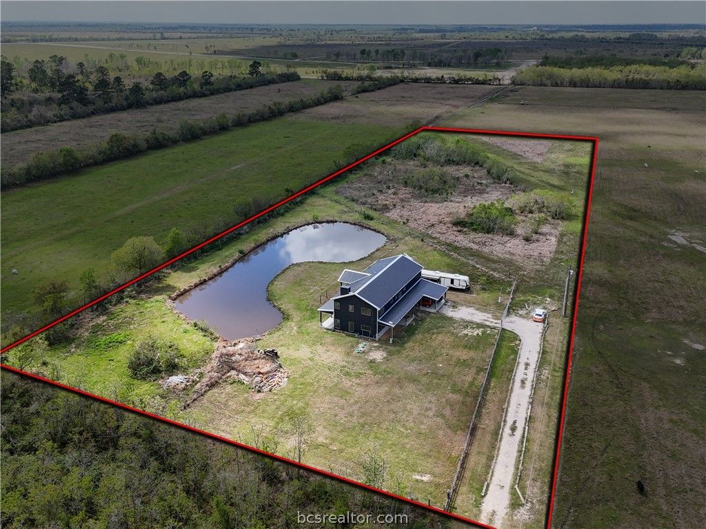 Modern barndominium on +/- 5 unrestricted acres built in 2024 offering versatile living space. This thoughtfully designed home features an open-concept layout with soaring ceilings, abundant natural light & a striking floor-to-ceiling fireplace. The island kitchen includes quartz countertops, stainless Samsung appliances, open shelving &a walk-in pantry, flowing seamlessly into the main living area. Flexible spaces include multiple living areas, loft & home office options to suit a variety of needs. The primary suite offers a soaking tub, walk-in shower, dual vanities & 2 large walk-in closets with built-ins; one of which has washer/dryer. Enjoy outdoor living with a covered patio overlooking a private pond & open acreage. Additional features include a 2.5-car garage, covered parking & gated entry with FM road access. A gated entrance, covered parking & a private pond set the tone for this refined property, offering expansive acreage, scenic views & a peaceful, private atmosphere.