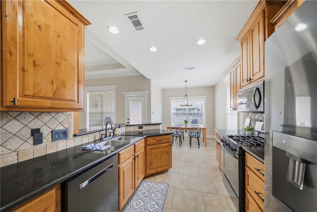 Beautifully maintained and move-in ready, this 3-bedroom, 2-bath home in sought-after Edelweiss Gartens offers wonderful curb appeal with a covered front porch and mature oak tree. Inside, high ceilings and abundant natural light create an inviting feel, while the open living, kitchen, and dining layout is perfect for everyday living and entertaining. The living room is anchored by a stunning stone fireplace, and oversized windows bring in peaceful backyard views. The kitchen features granite countertops, stained custom cabinetry, tile backsplash, an eating bar, and updated LG appliances including a gas range. A split-bedroom floor plan offers privacy, with two spacious secondary bedrooms and a full bath near the front of the home separated by a built-in desk/study nook, while the oversized primary suite is tucked away in the rear and includes wood flooring, double sinks, a large vanity, separate jetted tub, walk-in shower, and spacious closet. Tile floors run through the main living areas with carpet in the secondary bedrooms, and the extended back patio creates the perfect spot to relax outdoors. Conveniently located in south College Station near CSISD schools, shopping, dining, and parks, this is a home buyers won't want to miss.