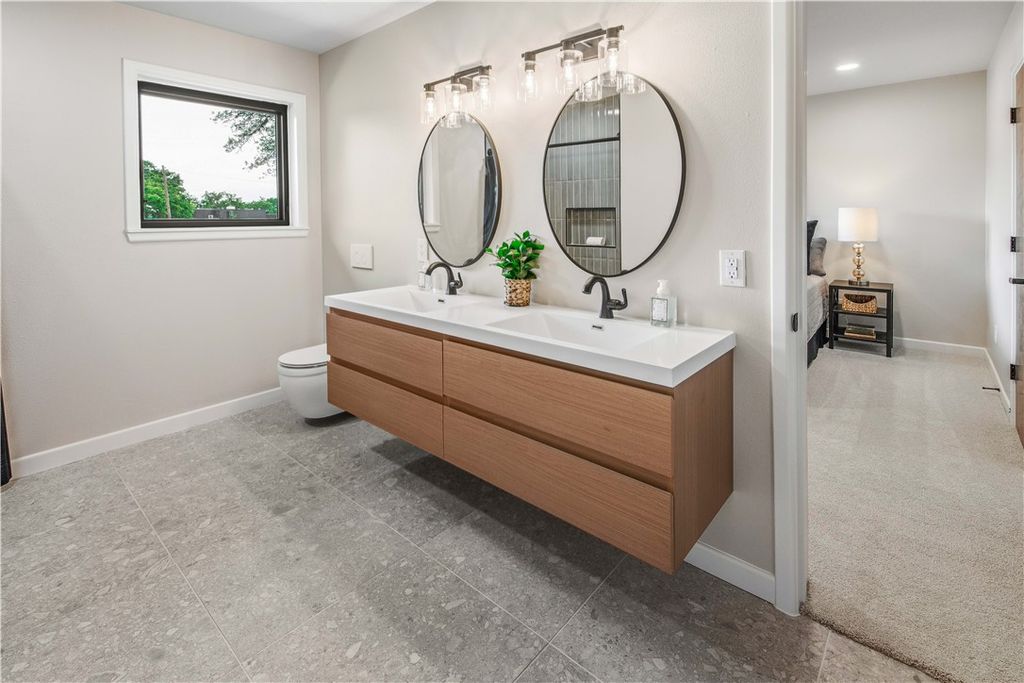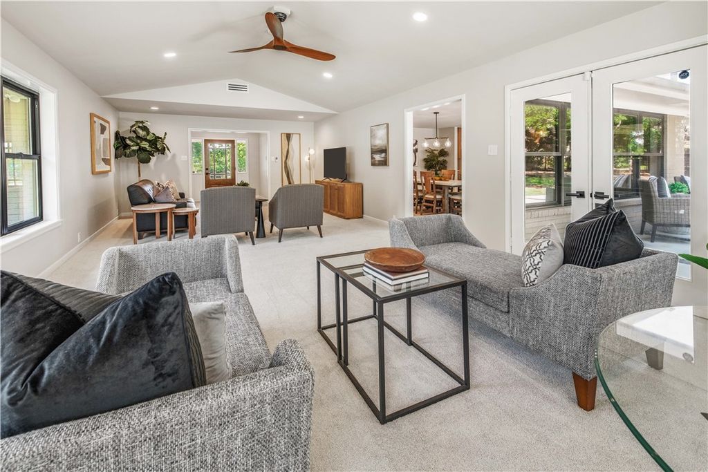 This beautifully renovated mid-century ranch style home is located on a private 1.4 acre lot with massive oak trees in the prestigious Beverly Estates neighborhood. Large windows throughout the home create a seamless connection between indoors and out. The living area flows effortlessly into a stunning kitchen with waterfall edge quartz countertops, commercial-grade range, sleek custom cabinetry and gorgeous views of the oak trees and outdoor entertainment areas in the fenced backyard. The cozy den has narrow plank hardwood flooring, is anchored by a central fireplace and flanked by the original cabinetry. This home features 2 master bedrooms located on opposite wings of the house for complete privacy. Two generously sized guest bedrooms share a large Jack-and-Jill bathroom with 2 sinks, soaking tub and shower. The backyard features many areas for outdoor entertaining or quiet time beneath a shade tree or pergola. The inviting pool and pool decking allows plenty of space for tanning while the large pergola with adjustable top allows for partial shade or a full shade and refuge from the weather. The property also includes a two car garage with extra storage and a full additional workshop with electricity and roll up door. Located just minutes from Texas A&M University, this home is ideal for a primary residence or Game Day property.