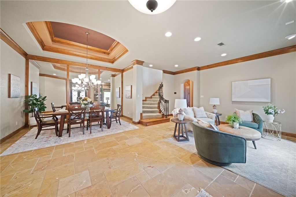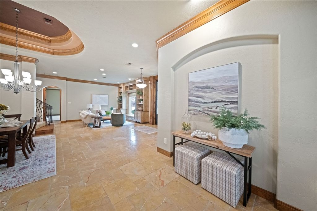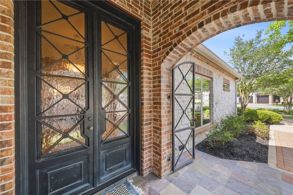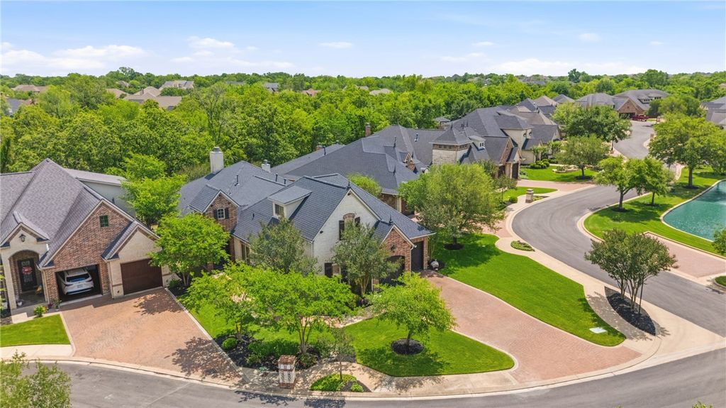 Experience refined living in this high-end custom-built home in the highly sought-after Gardens of Castlegate, a gated community centered around a picturesque pond. Welcome into an elegant entry featuring a formal dining and sitting area adorned with custom built-ins. The heart of the home is the chef's kitchen, boasting an oversized island, abundant cabinetry and counter space, beautiful granite countertops and wood ceiling accents. Designed for both everyday living and entertaining, the kitchen opens seamlessly to a secondary dining area and the main living room. Here, you'll find a corner stone fireplace that creates a warm, inviting atmosphere. The primary suite is a retreat with its own gas fireplace and private access to the back porch. The spa-like ensuite bath offers a soaking tub, walk-in shower, dual vanities, a private water closet, and a walk-in closet. Functionality meets sophistication with a dedicated home office featuring built-in desks and shelving. Downstairs also includes an additional bedroom with a private bath and additional half bath. Upstairs, a third bedroom with its own ensuite provides privacy and flexibility. High-end, custom finishes are showcased throughout the home, elevating every space. Enjoy the covered patio with a built-in grill and outdoor fireplace while taking in the peaceful views as the property backs to green space. This exceptional home combines luxury, comfort, and thoughtful design in one of the area's most desirable communities.