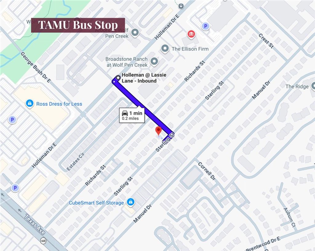 Spacious 5-bedroom, 4-bathroom two-story home ideally located just minutes from Texas A&M University"”making it an excellent opportunity for student housing or investment! Situated right off Texas Ave and Holleman, this property offers convenient access to shopping, dining, and coffee shops, plus a nearby bus stop for easy campus transportation. The functional floor plan features 2 bedrooms and 2 full bathrooms downstairs, with 3 bedrooms and 2 bathrooms upstairs"”perfect for shared living arrangements. The upstairs includes a well-designed shared bathroom with a large vanity and private toilet area for added convenience. Enjoy a bright and open living space with soaring vaulted ceilings, along with a well-appointed kitchen featuring granite countertops and an island. All bedrooms offer generous space and closets, providing comfort for every occupant. Major system updates include a 2025 HVAC system and a 2021 roof, offering added value and peace of mind. Additional highlights include a large parking pad, fenced backyard, and close proximity to Wolf Pen Creek Park, where you'll find walking/jogging trails, disc golf, and an outdoor amphitheater. Currently leased through July 28, 2026, offering immediate rental income with occupancy available August 2026!