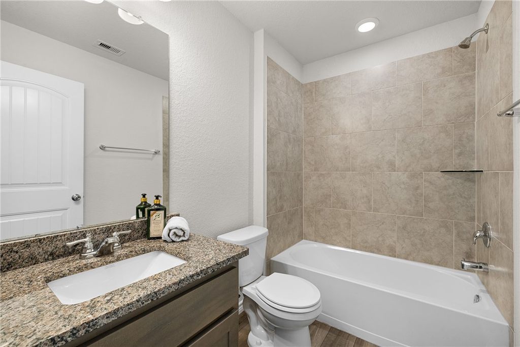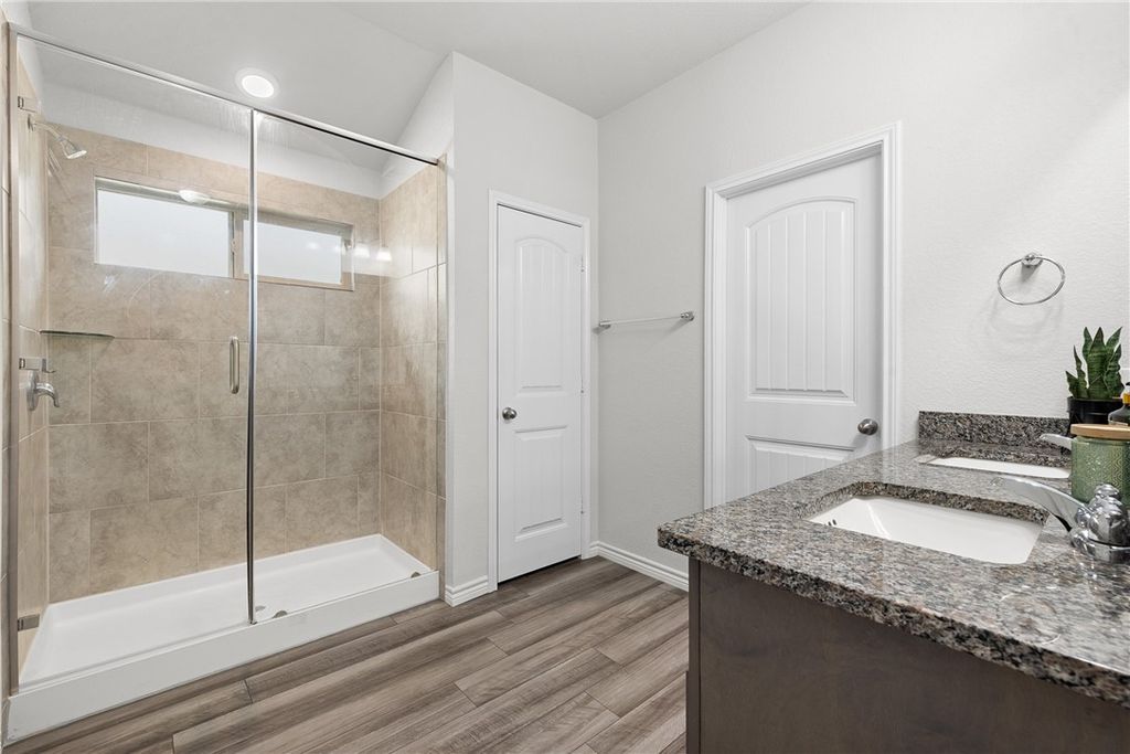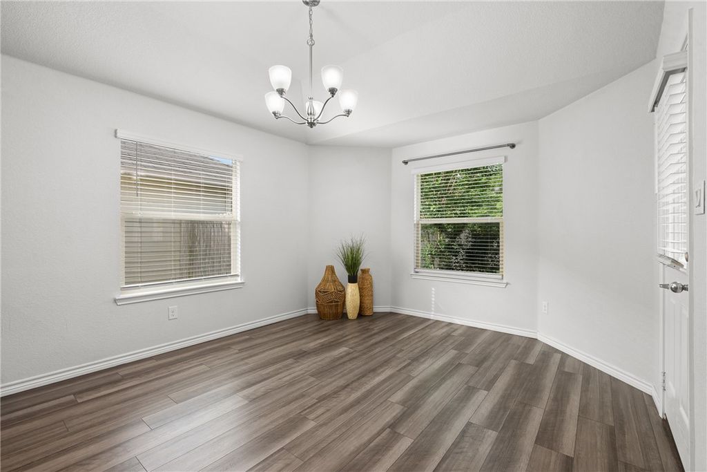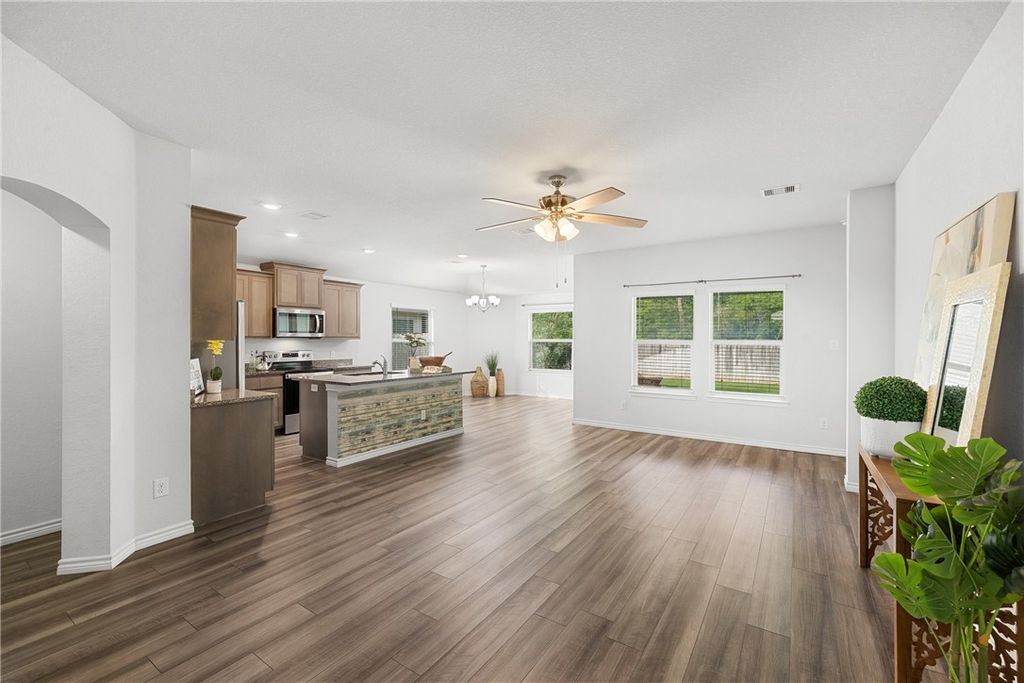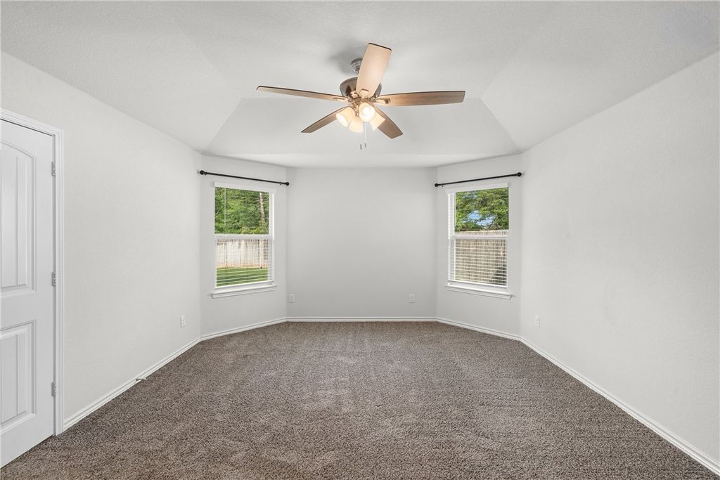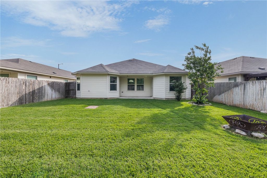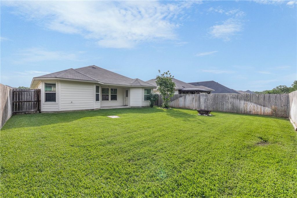 Beautiful 3-bedroom, 2-bath home in the heart of Bryan, backing up to protected green space with peaceful, private woodland views. Large windows across the back of the home fill the space with natural light and create a bright, open atmosphere throughout the main living areas. The open-concept design features high ceilings and a spacious living area that flows seamlessly into the kitchen and dining space for both everyday living and entertaining. The kitchen is equipped with granite countertops, stainless steel appliances, and a large island for gathering around. The primary suite offers a relaxing retreat with dual vanities, a walk-in shower, and a generous walk-in closet. Two additional bedrooms provide flexibility for guests, a home office, or other needs. Enjoy the added privacy of no rear neighbors and the convenience of being located approximately 1.5 miles from Lake Bryan. Community amenities include a pool, with nearby access to shopping, dining, and outdoor recreation.